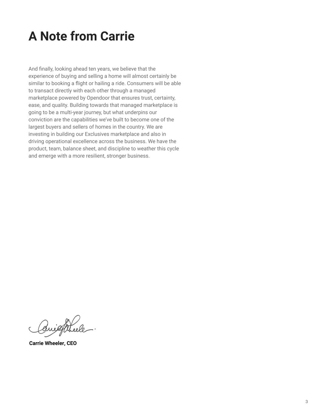 And finally, looking ahead ten years, we believe that the experience of buying and selling a home will almost certainly be similar to booking a flight or hailing a ride. Consumers will be able to transact directly with each other through a managed marketplace powered by Opendoor that ensures trust, certainty, ease, and quality. Building towards that managed marketplace is going to be a multi-year journey, but what underpins our conviction are the capabilities we’ve built to become one of the largest buyers and sellers of homes in the country. We are investing in building our Exclusives marketplace and also in driving operational excellence across the business. We have the product, team, balance sheet, and discipline to weather this cycle and emerge with a more resilient, stronger business. Carrie Wheeler, CEO 3 A Note from Carrie