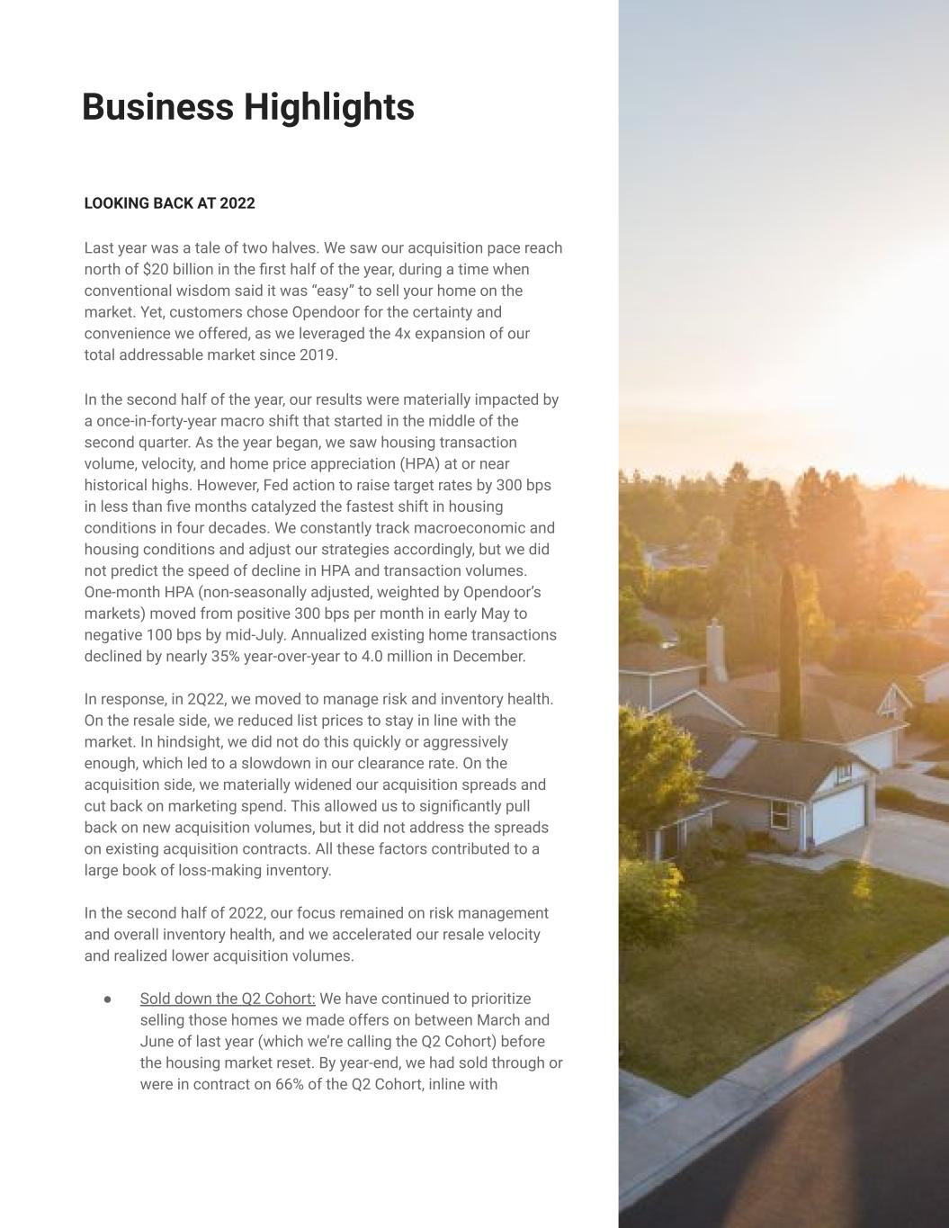 guidance provided last quarter, at a cumulative contribution margin of approximately (3.8)%. We expect to have sold or be in contract on over 85% of the cohort by the end of 1Q23. Once the “old book” is behind us, we expect to return to positive unit margins by the second half of 2023. To sell these homes quickly while preserving as much margin as possible, we revisited and reset all our portfolio management processes to drive above-market clearance rates. Examples include resetting our offer negotiation process and adjusting agent closing incentives. We believe these actions, coupled with the hard work of our operations teams, will allow us to sell through the Q2 Cohort earlier in 2023 than we had anticipated. ● Built into a new book of inventory: We have been acquiring new homes that can deliver healthy unit margins. We’ve sold nearly 40% of the homes we made offers on from July through November of 2022 (our “new book”). To date for the homes that have been sold, the cumulative contribution margin is over 250 bps higher than our July through November 2021 offer cohort at the same sold-through point. We believe our new book is on track to generate contribution margins at or in excess of our annual target of 4% to 6% once fully sold through. This underscores our ability to adjust spreads to realize attractive cohorts with positive unit economics across up, flat, and down home price markets. ● Right-sized our cost structure: In light of our pullback on acquisition volumes, we took action to right-size our cost structure in 2H22. We scaled back our operational capacity on a run-rate basis by 40% and reduced marketing spend by approximately 65% versus 2Q22 peak levels. Together with headcount reductions announced last quarter, we reduced our run-rate expenses by approximately $110 million on an annualized basis relative to 2022 peak levels. 2023 FOCUS AREAS As we enter 2023, we are building towards a managed marketplace for real estate that provides customers with a certain and simple 6 % of Q2 Cohort Expected to be Sold or in Resale Contract by End of 1Q23 Business Highlights >85%