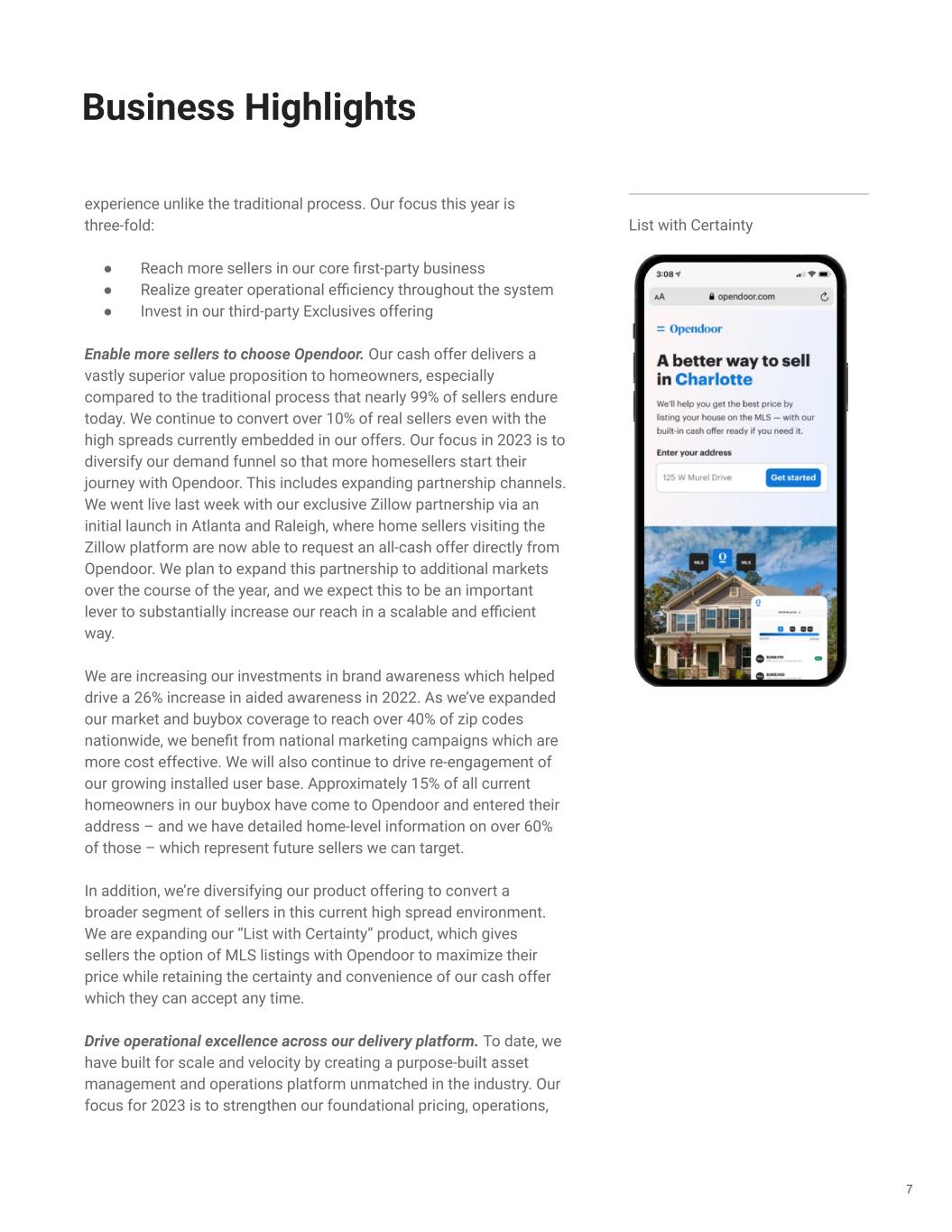 experience unlike the traditional process. Our focus this year is three-fold: ● Reach more sellers in our core first-party business ● Realize greater operational efficiency throughout the system ● Invest in our third-party Exclusives offering Enable more sellers to choose Opendoor. Our cash offer delivers a vastly superior value proposition to homeowners, especially compared to the traditional process that nearly 99% of sellers endure today. We continue to convert over 10% of real sellers even with the high spreads currently embedded in our offers. Our focus in 2023 is to diversify our demand funnel so that more homesellers start their journey with Opendoor. This includes expanding partnership channels. We went live last week with our exclusive Zillow partnership via an initial launch in Atlanta and Raleigh, where home sellers visiting the Zillow platform are now able to request an all-cash offer directly from Opendoor. We plan to expand this partnership to additional markets over the course of the year, and we expect this to be an important lever to substantially increase our reach in a scalable and efficient way. We are increasing our investments in brand awareness which helped drive a 26% increase in aided awareness in 2022. As we’ve expanded our market and buybox coverage to reach over 40% of zip codes nationwide, we benefit from national marketing campaigns which are more cost effective. We will also continue to drive re-engagement of our growing installed user base. Approximately 15% of all current homeowners in our buybox have come to Opendoor and entered their address – and we have detailed home-level information on over 60% of those – which represent future sellers we can target. In addition, we’re diversifying our product offering to convert a broader segment of sellers in this current high spread environment. We are expanding our “List with Certainty” product, which gives sellers the option of MLS listings with Opendoor to maximize their price while retaining the certainty and convenience of our cash offer which they can accept any time. Drive operational excellence across our delivery platform. To date, we have built for scale and velocity by creating a purpose-built asset management and operations platform unmatched in the industry. Our focus for 2023 is to strengthen our foundational pricing, operations, 7 Business Highlights List with Certainty