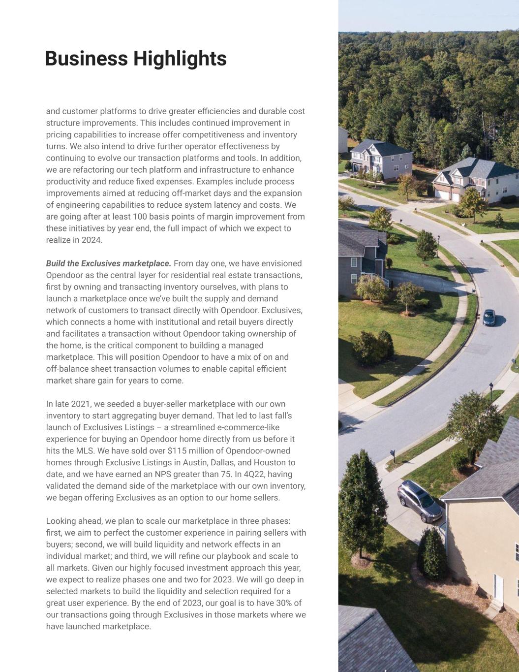 and customer platforms to drive greater efficiencies and durable cost structure improvements. This includes continued improvement in pricing capabilities to increase offer competitiveness and inventory turns. We also intend to drive further operator effectiveness by continuing to evolve our transaction platforms and tools. In addition, we are refactoring our tech platform and infrastructure to enhance productivity and reduce fixed expenses. Examples include process improvements aimed at reducing off-market days and the expansion of engineering capabilities to reduce system latency and costs. We are going after at least 100 basis points of margin improvement from these initiatives by year end, the full impact of which we expect to realize in 2024. Build the Exclusives marketplace. From day one, we have envisioned Opendoor as the central layer for residential real estate transactions, first by owning and transacting inventory ourselves, with plans to launch a marketplace once we’ve built the supply and demand network of customers to transact directly with Opendoor. Exclusives, which connects a home with institutional and retail buyers directly and facilitates a transaction without Opendoor taking ownership of the home, is the critical component to building a managed marketplace. This will position Opendoor to have a mix of on and off-balance sheet transaction volumes to enable capital efficient market share gain for years to come. In late 2021, we seeded a buyer-seller marketplace with our own inventory to start aggregating buyer demand. That led to last fall’s launch of Exclusives Listings – a streamlined e-commerce-like experience for buying an Opendoor home directly from us before it hits the MLS. We have sold over $115 million of Opendoor-owned homes through Exclusive Listings in Austin, Dallas, and Houston to date, and we have earned an NPS greater than 75. In 4Q22, having validated the demand side of the marketplace with our own inventory, we began offering Exclusives as an option to our home sellers. Looking ahead, we plan to scale our marketplace in three phases: first, we aim to perfect the customer experience in pairing sellers with buyers; second, we will build liquidity and network effects in an individual market; and third, we will refine our playbook and scale to all markets. Given our highly focused investment approach this year, we expect to realize phases one and two for 2023. We will go deep in selected markets to build the liquidity and selection required for a great user experience. By the end of 2023, our goal is to have 30% of our transactions going through Exclusives in those markets where we have launched marketplace. 8 Expected Margin Improvement in 2024 via Increased Efficiencies Business Highlights >100 bps