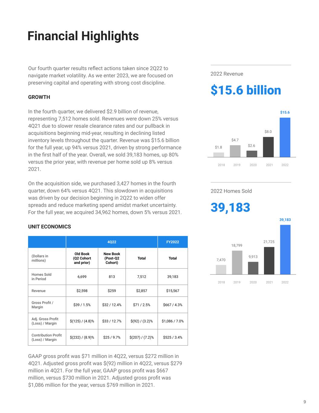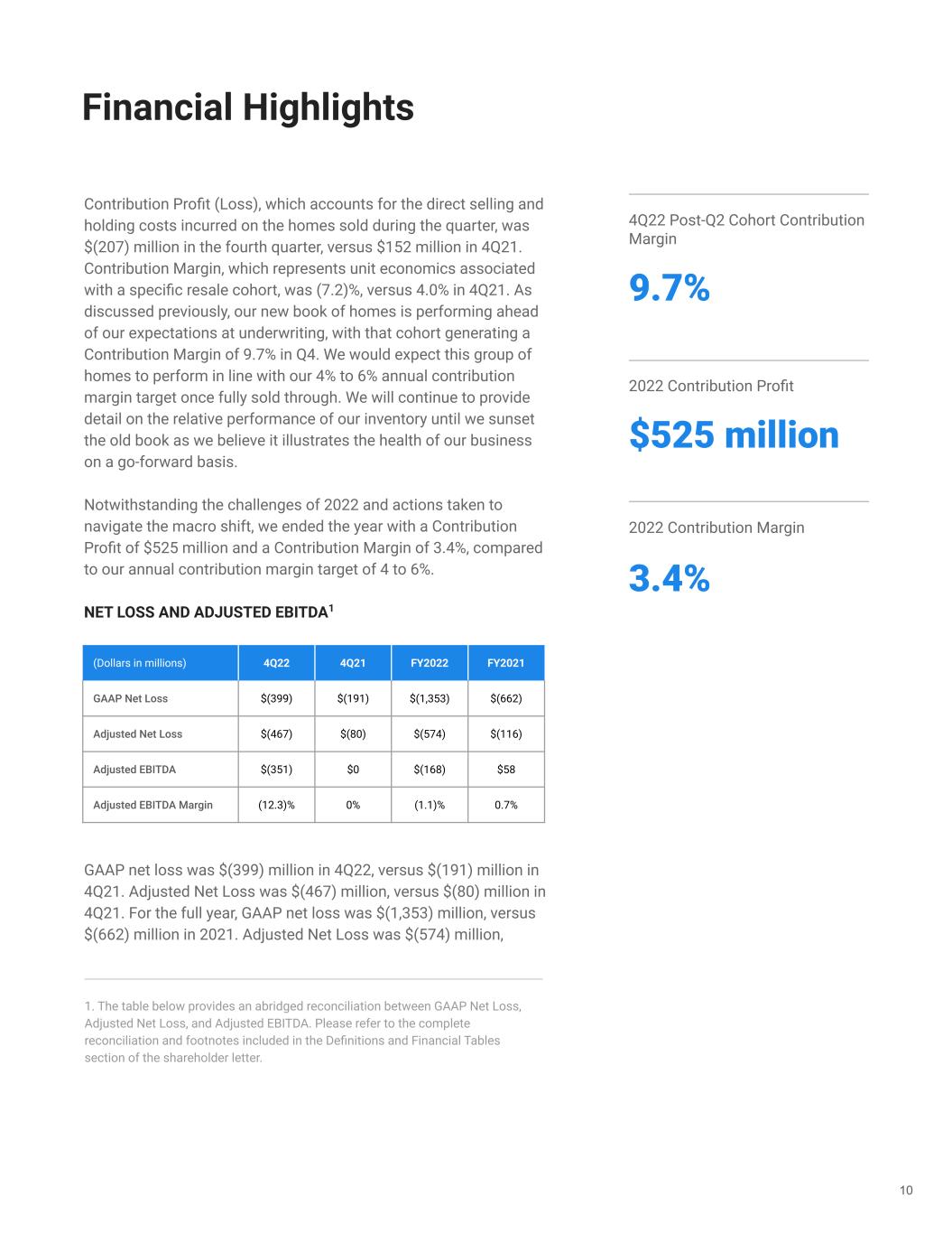 Our fourth quarter results reflect actions taken since 2Q22 to navigate market volatility. As we enter 2023, we are focused on preserving capital and operating with strong cost discipline. GROWTH In the fourth quarter, we delivered $2.9 billion of revenue, representing 7,512 homes sold. Revenues were down 25% versus 4Q21 due to slower resale clearance rates and our pullback in acquisitions beginning mid-year, resulting in declining listed inventory levels throughout the quarter. Revenue was $15.6 billion for the full year, up 94% versus 2021, driven by strong performance in the first half of the year. Overall, we sold 39,183 homes, up 80% versus the prior year, with revenue per home sold up 8% versus 2021. On the acquisition side, we purchased 3,427 homes in the fourth quarter, down 64% versus 4Q21. This slowdown in acquisitions was driven by our decision beginning in 2Q22 to widen offer spreads and reduce marketing spend amidst market uncertainty. For the full year, we acquired 34,962 homes, down 5% versus 2021. UNIT ECONOMICS GAAP gross profit was $71 million in 4Q22, versus $272 million in 4Q21. Adjusted gross profit was $(92) million in 4Q22, versus $279 million in 4Q21. For the full year, GAAP gross profit was $667 million, versus $730 million in 2021. Adjusted gross profit was $1,086 million for the year, versus $769 million in 2021. 9 Financial Highlights 2022 Revenue $15.6 billion 2022 Homes Sold 39,183 2018 2019 2020 2021 2022 9,913 7,470 18,799 39,183 21,725 2018 2019 2020 2021 2022 $2.6$1.8 $4.7 $15.6 $8.0 4Q22 FY2022 (Dollars in millions) Old Book (Q2 Cohort and prior) New Book (Post-Q2 Cohort) Total Total Homes Sold in Period 6,699 813 7,512 39,183 Revenue $2,598 $259 $2,857 $15,567 Gross Profit / Margin $39 / 1.5% $32 / 12.4% $71 / 2.5% $667 / 4.3% Adj. Gross Profit (Loss) / Margin $(125) / (4.8)% $33 / 12.7% $(92) / (3.2)% $1,086 / 7.0% Contribution Profit (Loss) / Margin $(232) / (8.9)% $25 / 9.7% $(207) / (7.2)% $525 / 3.4%