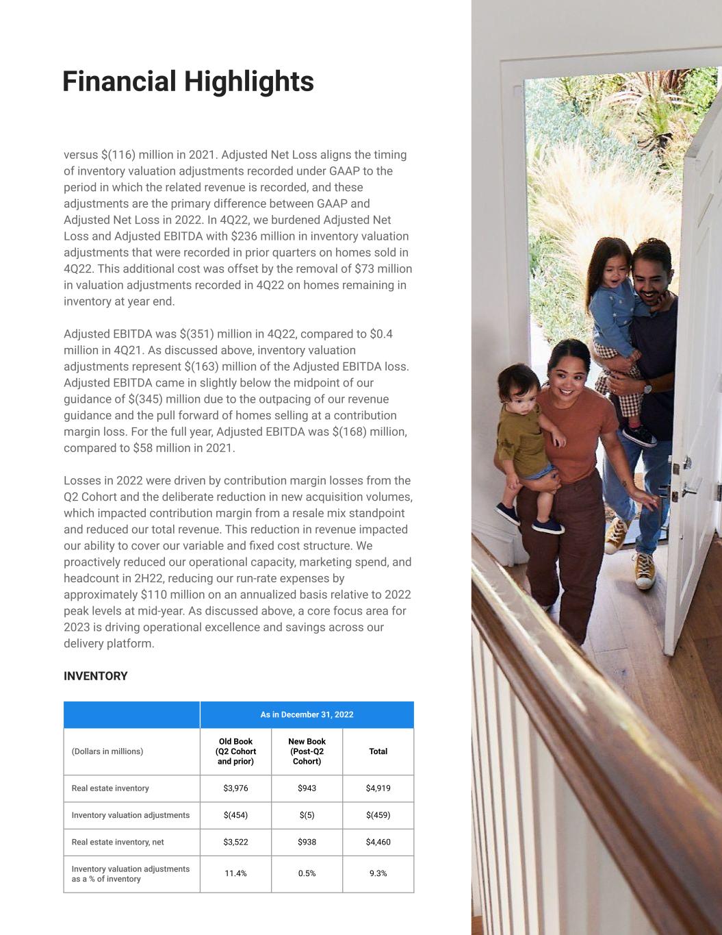 11 Financial Highlights versus $(116) million in 2021. Adjusted Net Loss aligns the timing of inventory valuation adjustments recorded under GAAP to the period in which the related revenue is recorded, and these adjustments are the primary difference between GAAP and Adjusted Net Loss in 2022. In 4Q22, we burdened Adjusted Net Loss and Adjusted EBITDA with $236 million in inventory valuation adjustments that were recorded in prior quarters on homes sold in 4Q22. This additional cost was offset by the removal of $73 million in valuation adjustments recorded in 4Q22 on homes remaining in inventory at year end. Adjusted EBITDA was $(351) million in 4Q22, compared to $0.4 million in 4Q21. As discussed above, inventory valuation adjustments represent $(163) million of the Adjusted EBITDA loss. Adjusted EBITDA came in slightly below the midpoint of our guidance of $(345) million due to the outpacing of our revenue guidance and the pull forward of homes selling at a contribution margin loss. For the full year, Adjusted EBITDA was $(168) million, compared to $58 million in 2021. Losses in 2022 were driven by contribution margin losses from the Q2 Cohort and the deliberate reduction in new acquisition volumes, which impacted contribution margin from a resale mix standpoint and reduced our total revenue. This reduction in revenue impacted our ability to cover our variable and fixed cost structure. We proactively reduced our operational capacity, marketing spend, and headcount in 2H22, reducing our run-rate expenses by approximately $110 million on an annualized basis relative to 2022 peak levels at mid-year. As discussed above, a core focus area for 2023 is driving operational excellence and savings across our delivery platform. INVENTORY 4Q22 Post-Q2 Offer Cohort Contribution Margin 9.7% 2022 Contribution Profit $525 million 2022 Contribution Margin 3.4% As in December 31, 2022 (Dollars in millions) Old Book (Q2 Cohort and prior) New Book (Post-Q2 Cohort) Total Real estate inventory $3,976 $943 $4,919 Inventory valuation adjustments $(454) $(5) $(459) Real estate inventory, net $3,522 $938 $4,460 Inventory valuation adjustments as a % of inventory 11.4% 0.5% 9.3%