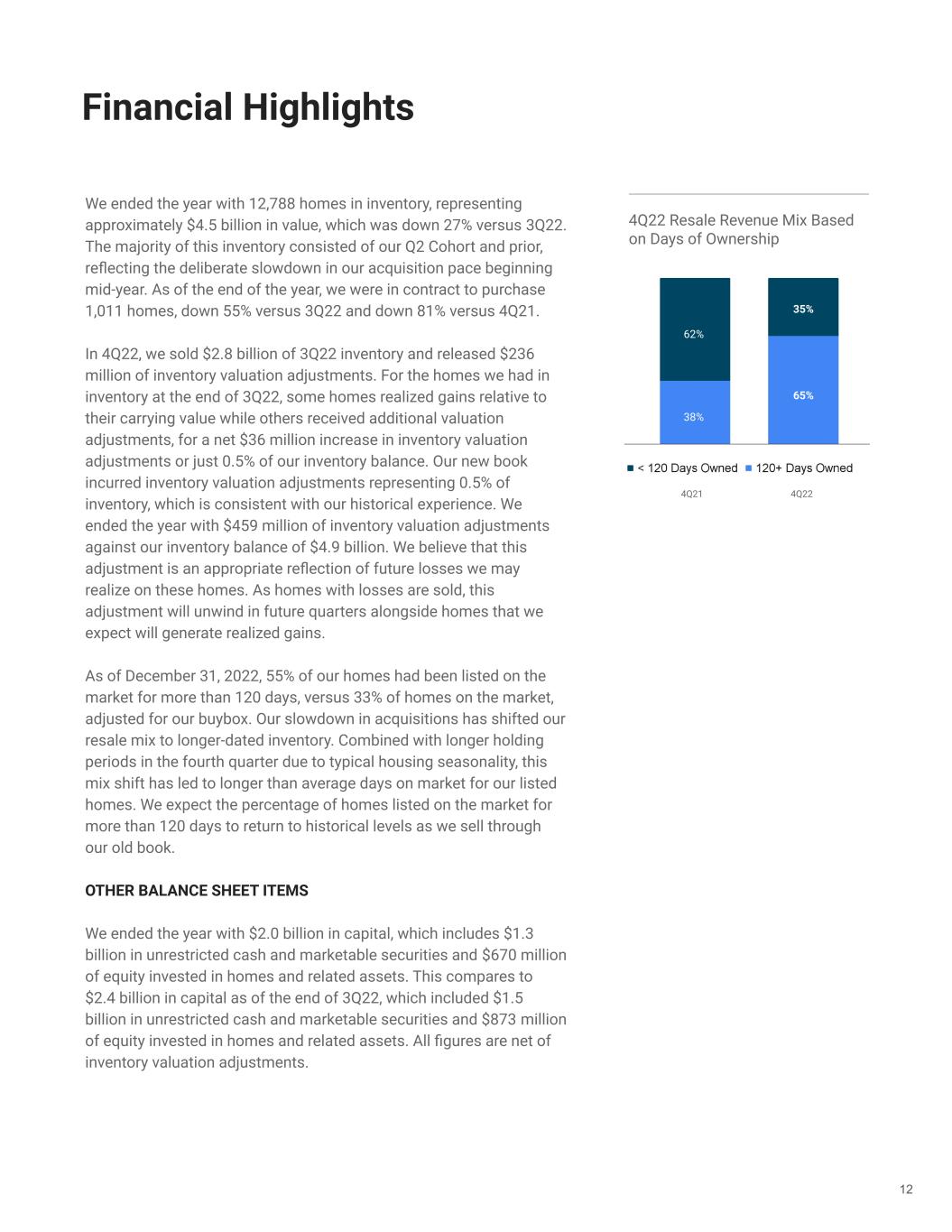 Financial Highlights 4Q22 Resale Revenue Mix Based on Days of Ownership We ended the year with 12,788 homes in inventory, representing approximately $4.5 billion in value, which was down 27% versus 3Q22. The majority of this inventory consisted of our Q2 Cohort and prior, reflecting the deliberate slowdown in our acquisition pace beginning mid-year. As of the end of the year, we were in contract to purchase 1,011 homes, down 55% versus 3Q22 and down 81% versus 4Q21. In 4Q22, we sold $2.8 billion of 3Q22 inventory and released $236 million of inventory valuation adjustments. For the homes we had in inventory at the end of 3Q22, some homes realized gains relative to their carrying value while others received additional valuation adjustments, for a net $36 million increase in inventory valuation adjustments or just 0.5% of our inventory balance. Our new book incurred inventory valuation adjustments representing 0.5% of inventory, which is consistent with our historical experience. We ended the year with $459 million of inventory valuation adjustments against our inventory balance of $4.9 billion. We believe that this adjustment is an appropriate reflection of future losses we may realize on these homes. As homes with losses are sold, this adjustment will unwind in future quarters alongside homes that we expect will generate realized gains. As of December 31, 2022, 55% of our homes had been listed on the market for more than 120 days, versus 33% of homes on the market, adjusted for our buybox. Our slowdown in acquisitions has shifted our resale mix to longer-dated inventory. Combined with longer holding periods in the fourth quarter due to typical housing seasonality, this mix shift has led to longer than average days on market for our listed homes. We expect the percentage of homes listed on the market for more than 120 days to return to historical levels as we sell through our old book. OTHER BALANCE SHEET ITEMS We ended the year with $2.0 billion in capital, which includes $1.3 billion in unrestricted cash and marketable securities and $670 million of equity invested in homes and related assets. This compares to $2.4 billion in capital as of the end of 3Q22, which included $1.5 billion in unrestricted cash and marketable securities and $873 million of equity invested in homes and related assets. All figures are net of inventory valuation adjustments. 65% 4Q21 4Q22 35% 38% 62% 12