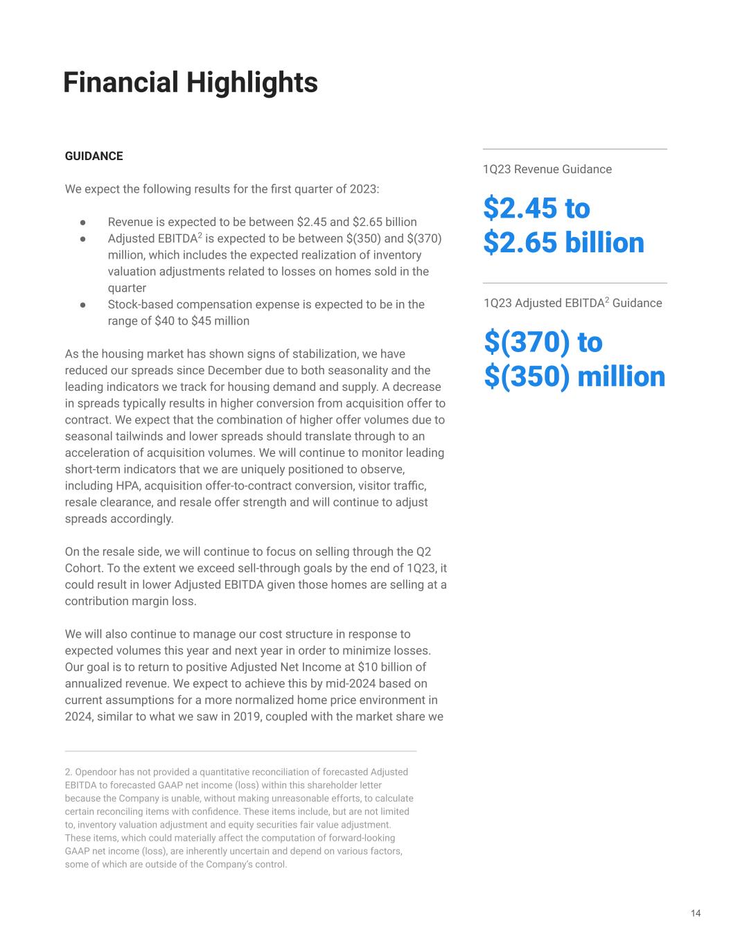 14 Financial Highlights 2. Opendoor has not provided a quantitative reconciliation of forecasted Adjusted EBITDA to forecasted GAAP net income (loss) within this shareholder letter because the Company is unable, without making unreasonable efforts, to calculate certain reconciling items with confidence. These items include, but are not limited to, inventory valuation adjustment and equity securities fair value adjustment. These items, which could materially affect the computation of forward-looking GAAP net income (loss), are inherently uncertain and depend on various factors, some of which are outside of the Company’s control. GUIDANCE We expect the following results for the first quarter of 2023: ● Revenue is expected to be between $2.45 and $2.65 billion ● Adjusted EBITDA2 is expected to be between $(350) and $(370) million, which includes the expected realization of inventory valuation adjustments related to losses on homes sold in the quarter ● Stock-based compensation expense is expected to be in the range of $40 to $45 million As the housing market has shown signs of stabilization, we have reduced our spreads since December due to both seasonality and the leading indicators we track for housing demand and supply. A decrease in spreads typically results in higher conversion from acquisition offer to contract. We expect that the combination of higher offer volumes due to seasonal tailwinds and lower spreads should translate through to an acceleration of acquisition volumes. We will continue to monitor leading short-term indicators that we are uniquely positioned to observe, including HPA, acquisition offer-to-contract conversion, visitor traffic, resale clearance, and resale offer strength and will continue to adjust spreads accordingly. On the resale side, we will continue to focus on selling through the Q2 Cohort. To the extent we exceed sell-through goals by the end of 1Q23, it could result in lower Adjusted EBITDA given those homes are selling at a contribution margin loss. We will also continue to manage our cost structure in response to expected volumes this year and next year in order to minimize losses. Our goal is to return to positive Adjusted Net Income at $10 billion of annualized revenue. We expect to achieve this by mid-2024 based on current assumptions for a more normalized home price environment in 2024, similar to what we saw in 2019, coupled with the market share we 1Q23 Revenue Guidance $2.45 to $2.65 billion 1Q23 Adjusted EBITDA2 Guidance $(370) to $(350) million