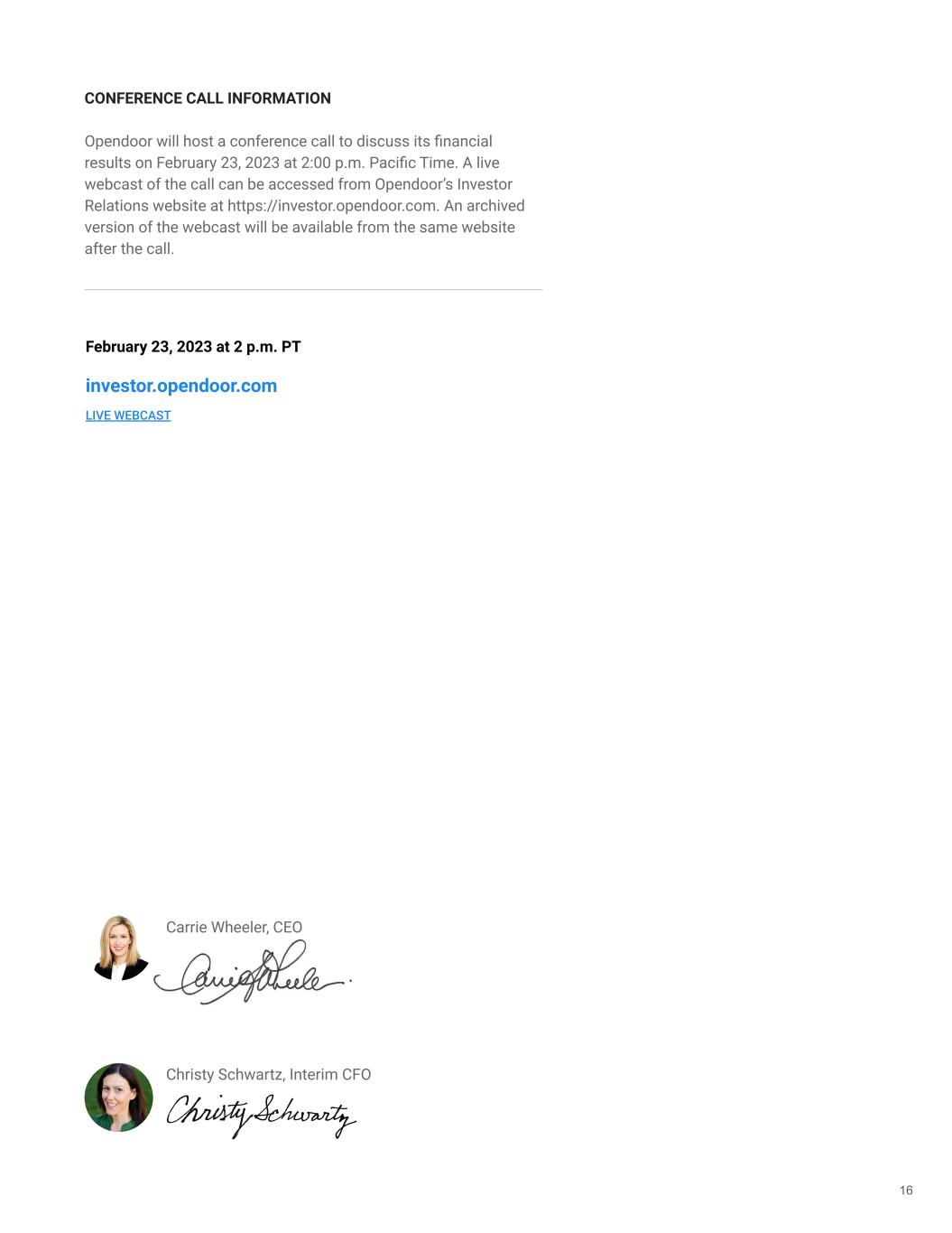 16Raleigh-Durham, NC Carrie Wheeler, CEO Christy Schwartz, Interim CFO CONFERENCE CALL INFORMATION Opendoor will host a conference call to discuss its financial results on February 23, 2023 at 2:00 p.m. Pacific Time. A live webcast of the call can be accessed from Opendoor’s Investor Relations website at https://investor.opendoor.com. An archived version of the webcast will be available from the same website after the call. February 23, 2023 at 2 p.m. PT investor.opendoor.com LIVE WEBCAST