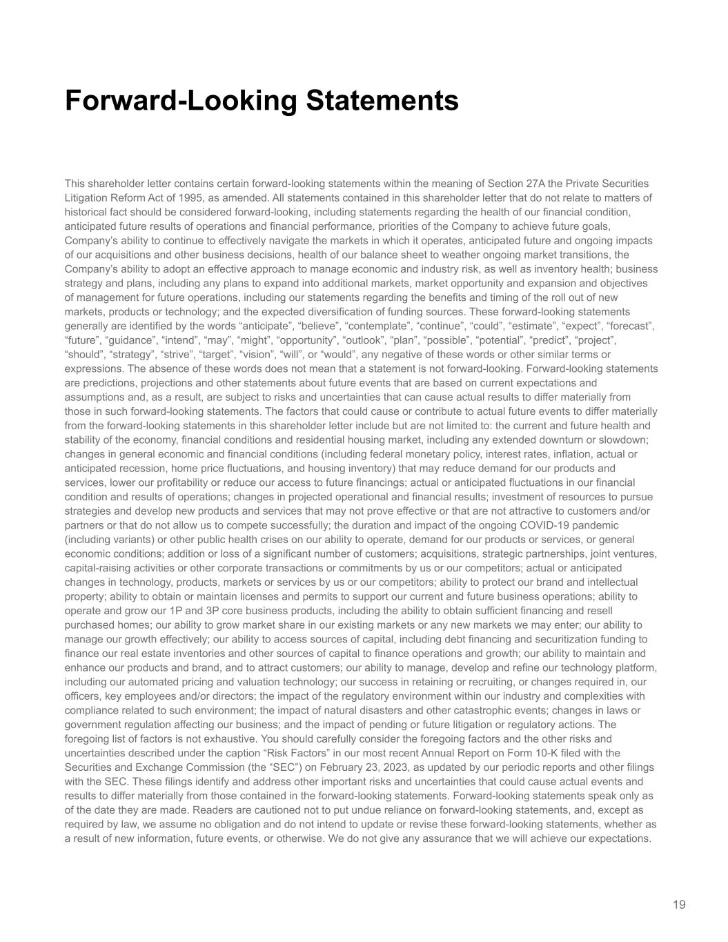 This shareholder letter contains certain forward-looking statements within the meaning of Section 27A the Private Securities Litigation Reform Act of 1995, as amended. All statements contained in this shareholder letter that do not relate to matters of historical fact should be considered forward-looking, including statements regarding the health of our financial condition, anticipated future results of operations and financial performance, priorities of the Company to achieve future goals, Company’s ability to continue to effectively navigate the markets in which it operates, anticipated future and ongoing impacts of our acquisitions and other business decisions, health of our balance sheet to weather ongoing market transitions, the Company’s ability to adopt an effective approach to manage economic and industry risk, as well as inventory health; business strategy and plans, including any plans to expand into additional markets, market opportunity and expansion and objectives of management for future operations, including our statements regarding the benefits and timing of the roll out of new markets, products or technology; and the expected diversification of funding sources. These forward-looking statements generally are identified by the words “anticipate”, “believe”, “contemplate”, “continue”, “could”, “estimate”, “expect”, “forecast”, “future”, “guidance”, “intend”, “may”, “might”, “opportunity”, “outlook”, “plan”, “possible”, “potential”, “predict”, “project”, “should”, “strategy”, “strive”, “target”, “vision”, “will”, or “would”, any negative of these words or other similar terms or expressions. The absence of these words does not mean that a statement is not forward-looking. Forward-looking statements are predictions, projections and other statements about future events that are based on current expectations and assumptions and, as a result, are subject to risks and uncertainties that can cause actual results to differ materially from those in such forward-looking statements. The factors that could cause or contribute to actual future events to differ materially from the forward-looking statements in this shareholder letter include but are not limited to: the current and future health and stability of the economy, financial conditions and residential housing market, including any extended downturn or slowdown; changes in general economic and financial conditions (including federal monetary policy, interest rates, inflation, actual or anticipated recession, home price fluctuations, and housing inventory) that may reduce demand for our products and services, lower our profitability or reduce our access to future financings; actual or anticipated fluctuations in our financial condition and results of operations; changes in projected operational and financial results; investment of resources to pursue strategies and develop new products and services that may not prove effective or that are not attractive to customers and/or partners or that do not allow us to compete successfully; the duration and impact of the ongoing COVID-19 pandemic (including variants) or other public health crises on our ability to operate, demand for our products or services, or general economic conditions; addition or loss of a significant number of customers; acquisitions, strategic partnerships, joint ventures, capital-raising activities or other corporate transactions or commitments by us or our competitors; actual or anticipated changes in technology, products, markets or services by us or our competitors; ability to protect our brand and intellectual property; ability to obtain or maintain licenses and permits to support our current and future business operations; ability to operate and grow our 1P and 3P core business products, including the ability to obtain sufficient financing and resell purchased homes; our ability to grow market share in our existing markets or any new markets we may enter; our ability to manage our growth effectively; our ability to access sources of capital, including debt financing and securitization funding to finance our real estate inventories and other sources of capital to finance operations and growth; our ability to maintain and enhance our products and brand, and to attract customers; our ability to manage, develop and refine our technology platform, including our automated pricing and valuation technology; our success in retaining or recruiting, or changes required in, our officers, key employees and/or directors; the impact of the regulatory environment within our industry and complexities with compliance related to such environment; the impact of natural disasters and other catastrophic events; changes in laws or government regulation affecting our business; and the impact of pending or future litigation or regulatory actions. The foregoing list of factors is not exhaustive. You should carefully consider the foregoing factors and the other risks and uncertainties described under the caption “Risk Factors” in our most recent Annual Report on Form 10-K filed with the Securities and Exchange Commission (the “SEC”) on February 23, 2023, as updated by our periodic reports and other filings with the SEC. These filings identify and address other important risks and uncertainties that could cause actual events and results to differ materially from those contained in the forward-looking statements. Forward-looking statements speak only as of the date they are made. Readers are cautioned not to put undue reliance on forward-looking statements, and, except as required by law, we assume no obligation and do not intend to update or revise these forward-looking statements, whether as a result of new information, future events, or otherwise. We do not give any assurance that we will achieve our expectations. 19 Forward-Looking Statements