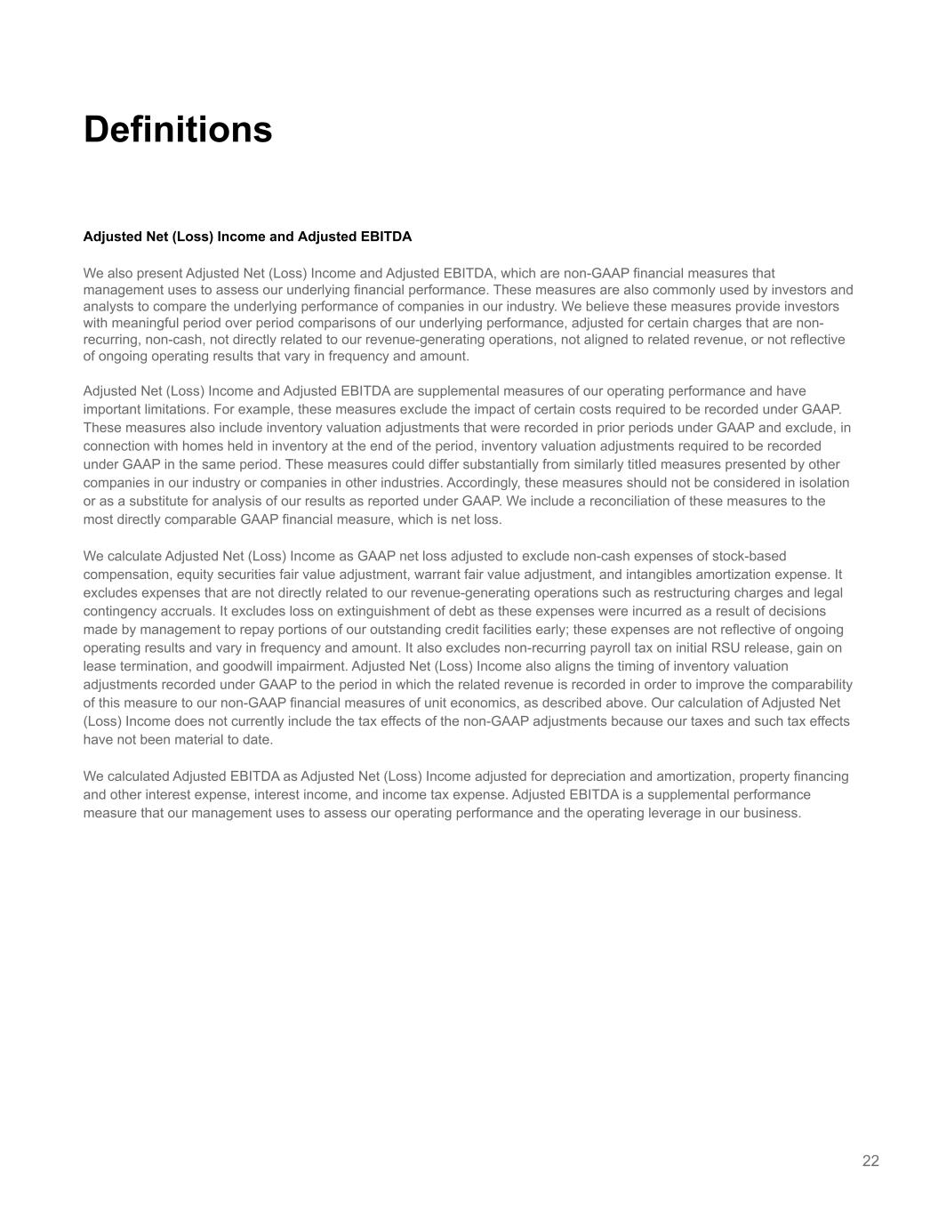 22 Adjusted Net (Loss) Income and Adjusted EBITDA We also present Adjusted Net (Loss) Income and Adjusted EBITDA, which are non-GAAP financial measures that management uses to assess our underlying financial performance. These measures are also commonly used by investors and analysts to compare the underlying performance of companies in our industry. We believe these measures provide investors with meaningful period over period comparisons of our underlying performance, adjusted for certain charges that are non- recurring, non-cash, not directly related to our revenue-generating operations, not aligned to related revenue, or not reflective of ongoing operating results that vary in frequency and amount. Adjusted Net (Loss) Income and Adjusted EBITDA are supplemental measures of our operating performance and have important limitations. For example, these measures exclude the impact of certain costs required to be recorded under GAAP. These measures also include inventory valuation adjustments that were recorded in prior periods under GAAP and exclude, in connection with homes held in inventory at the end of the period, inventory valuation adjustments required to be recorded under GAAP in the same period. These measures could differ substantially from similarly titled measures presented by other companies in our industry or companies in other industries. Accordingly, these measures should not be considered in isolation or as a substitute for analysis of our results as reported under GAAP. We include a reconciliation of these measures to the most directly comparable GAAP financial measure, which is net loss. We calculate Adjusted Net (Loss) Income as GAAP net loss adjusted to exclude non-cash expenses of stock-based compensation, equity securities fair value adjustment, warrant fair value adjustment, and intangibles amortization expense. It excludes expenses that are not directly related to our revenue-generating operations such as restructuring charges and legal contingency accruals. It excludes loss on extinguishment of debt as these expenses were incurred as a result of decisions made by management to repay portions of our outstanding credit facilities early; these expenses are not reflective of ongoing operating results and vary in frequency and amount. It also excludes non-recurring payroll tax on initial RSU release, gain on lease termination, and goodwill impairment. Adjusted Net (Loss) Income also aligns the timing of inventory valuation adjustments recorded under GAAP to the period in which the related revenue is recorded in order to improve the comparability of this measure to our non-GAAP financial measures of unit economics, as described above. Our calculation of Adjusted Net (Loss) Income does not currently include the tax effects of the non-GAAP adjustments because our taxes and such tax effects have not been material to date. We calculated Adjusted EBITDA as Adjusted Net (Loss) Income adjusted for depreciation and amortization, property financing and other interest expense, interest income, and income tax expense. Adjusted EBITDA is a supplemental performance measure that our management uses to assess our operating performance and the operating leverage in our business. Definitions