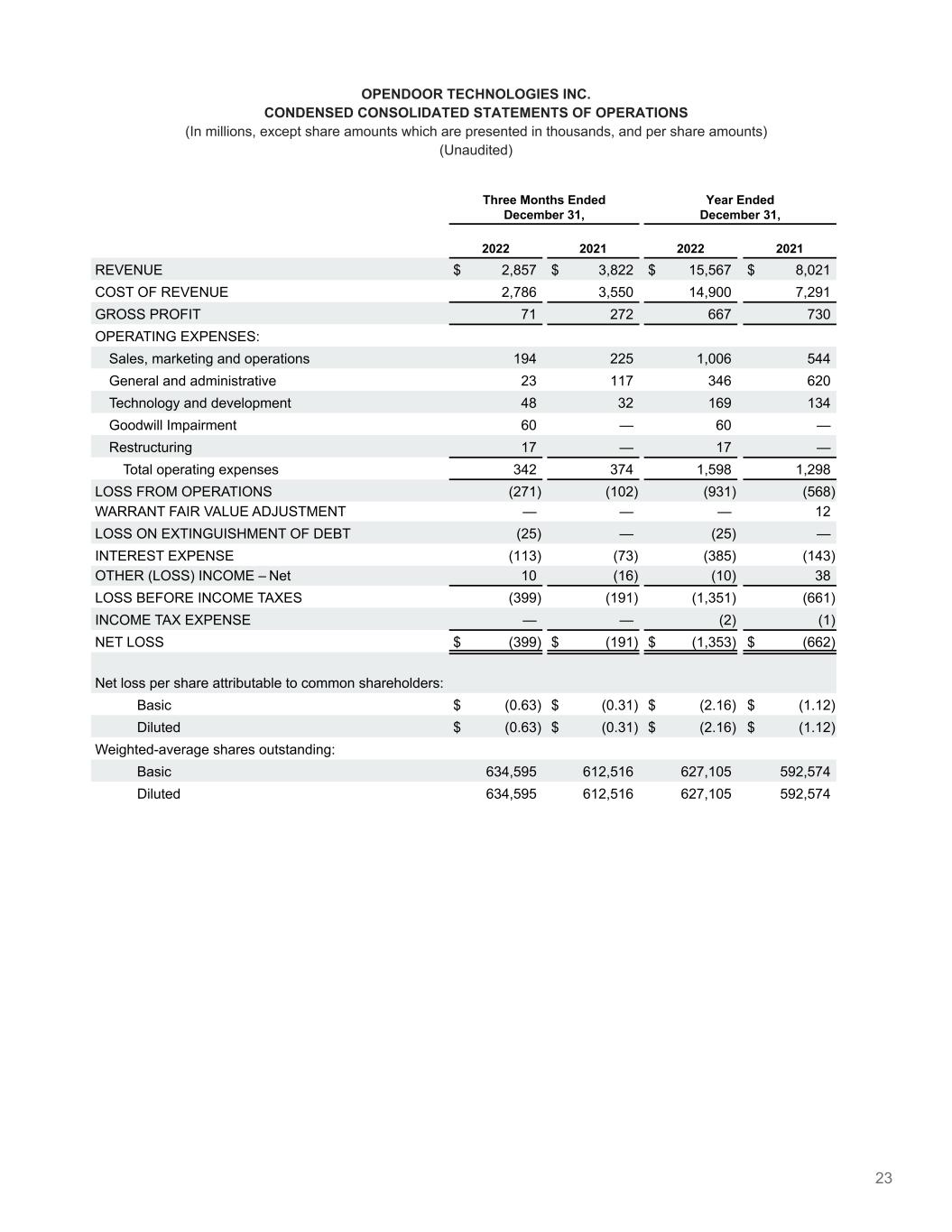 23 Three Months Ended December 31, Year Ended December 31, 2022 2021 2022 2021 REVENUE $ 2,857 $ 3,822 $ 15,567 $ 8,021 COST OF REVENUE 2,786 3,550 14,900 7,291 GROSS PROFIT 71 272 667 730 OPERATING EXPENSES: Sales, marketing and operations 194 225 1,006 544 General and administrative 23 117 346 620 Technology and development 48 32 169 134 Goodwill Impairment 60 — 60 — Restructuring 17 — 17 — Total operating expenses 342 374 1,598 1,298 LOSS FROM OPERATIONS (271) (102) (931) (568) WARRANT FAIR VALUE ADJUSTMENT — — — 12 LOSS ON EXTINGUISHMENT OF DEBT (25) — (25) — INTEREST EXPENSE (113) (73) (385) (143) OTHER (LOSS) INCOME – Net 10 (16) (10) 38 LOSS BEFORE INCOME TAXES (399) (191) (1,351) (661) INCOME TAX EXPENSE — — (2) (1) NET LOSS $ (399) $ (191) $ (1,353) $ (662) Net loss per share attributable to common shareholders: Basic $ (0.63) $ (0.31) $ (2.16) $ (1.12) Diluted $ (0.63) $ (0.31) $ (2.16) $ (1.12) Weighted-average shares outstanding: Basic 634,595 612,516 627,105 592,574 Diluted 634,595 612,516 627,105 592,574 OPENDOOR TECHNOLOGIES INC. CONDENSED CONSOLIDATED STATEMENTS OF OPERATIONS (In millions, except share amounts which are presented in thousands, and per share amounts) (Unaudited)