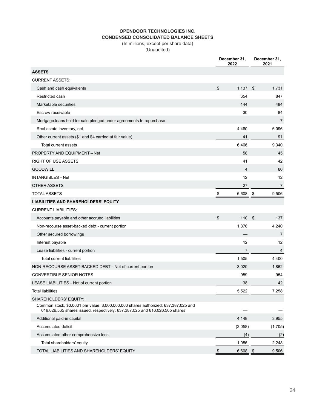 24 OPENDOOR TECHNOLOGIES INC. CONDENSED CONSOLIDATED BALANCE SHEETS (In millions, except per share data) (Unaudited) December 31, 2022 December 31, 2021 ASSETS CURRENT ASSETS: Cash and cash equivalents $ 1,137 $ 1,731 Restricted cash 654 847 Marketable securities 144 484 Escrow receivable 30 84 Mortgage loans held for sale pledged under agreements to repurchase — 7 Real estate inventory, net 4,460 6,096 Other current assets ($1 and $4 carried at fair value) 41 91 Total current assets 6,466 9,340 PROPERTY AND EQUIPMENT – Net 58 45 RIGHT OF USE ASSETS 41 42 GOODWILL 4 60 INTANGIBLES – Net 12 12 OTHER ASSETS 27 7 TOTAL ASSETS $ 6,608 $ 9,506 LIABILITIES AND SHAREHOLDERS’ EQUITY CURRENT LIABILITIES: Accounts payable and other accrued liabilities $ 110 $ 137 Non-recourse asset-backed debt - current portion 1,376 4,240 Other secured borrowings — 7 Interest payable 12 12 Lease liabilities - current portion 7 4 Total current liabilities 1,505 4,400 NON-RECOURSE ASSET-BACKED DEBT – Net of current portion 3,020 1,862 CONVERTIBLE SENIOR NOTES 959 954 LEASE LIABILITIES – Net of current portion 38 42 Total liabilities 5,522 7,258 SHAREHOLDERS’ EQUITY: Common stock, $0.0001 par value; 3,000,000,000 shares authorized; 637,387,025 and 616,026,565 shares issued, respectively; 637,387,025 and 616,026,565 shares — — Additional paid-in capital 4,148 3,955 Accumulated deficit (3,058) (1,705) Accumulated other comprehensive loss (4) (2) Total shareholders’ equity 1,086 2,248 TOTAL LIABILITIES AND SHAREHOLDERS’ EQUITY $ 6,608 $ 9,506