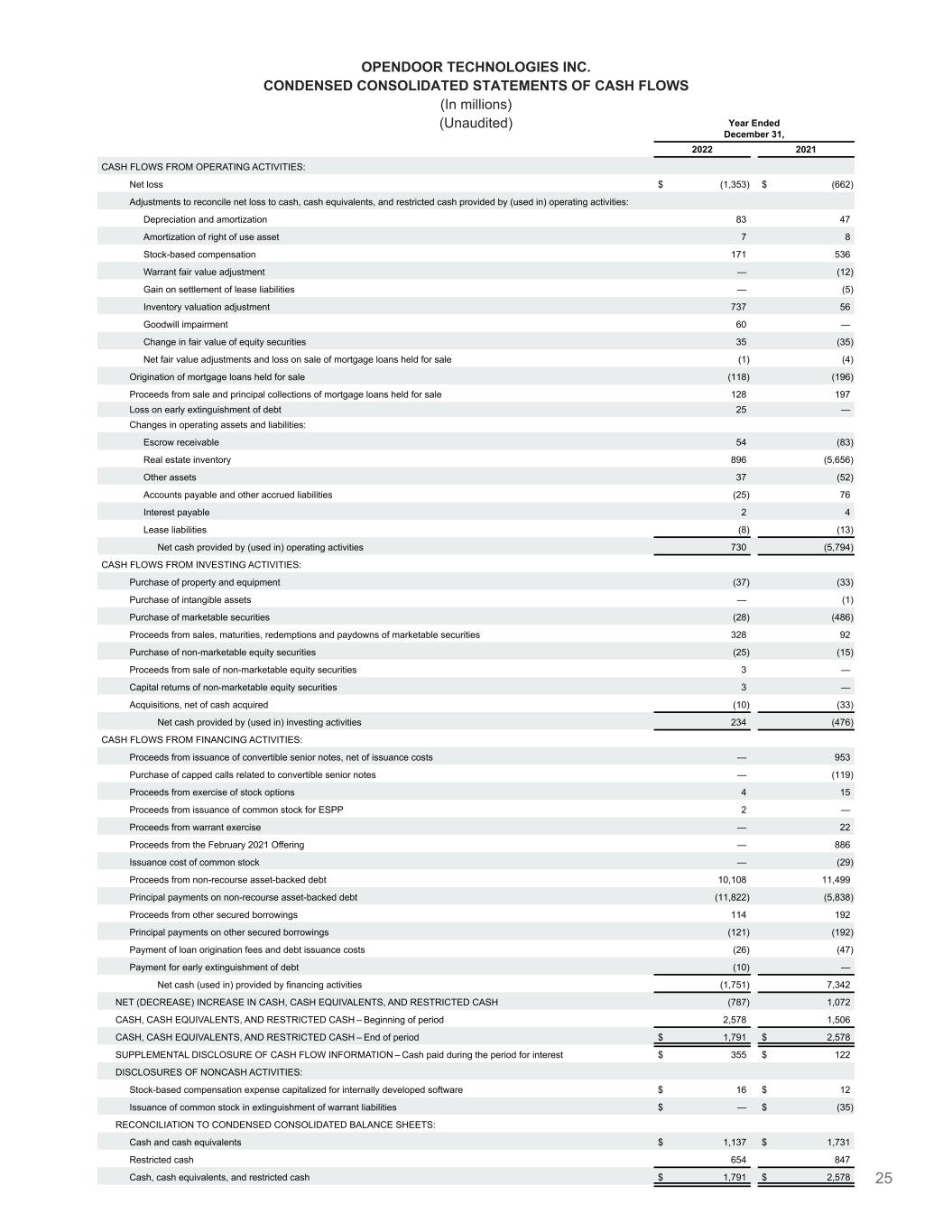 25 OPENDOOR TECHNOLOGIES INC. CONDENSED CONSOLIDATED STATEMENTS OF CASH FLOWS (In millions) (Unaudited) Year Ended December 31, 2022 2021 CASH FLOWS FROM OPERATING ACTIVITIES: Net loss $ (1,353) $ (662) Adjustments to reconcile net loss to cash, cash equivalents, and restricted cash provided by (used in) operating activities: Depreciation and amortization  83 47 Amortization of right of use asset 7 8 Stock-based compensation 171 536 Warrant fair value adjustment — (12) Gain on settlement of lease liabilities — (5) Inventory valuation adjustment 737 56 Goodwill impairment 60 — Change in fair value of equity securities 35 (35) Net fair value adjustments and loss on sale of mortgage loans held for sale (1) (4) Origination of mortgage loans held for sale (118) (196) Proceeds from sale and principal collections of mortgage loans held for sale 128 197 Loss on early extinguishment of debt 25 — Changes in operating assets and liabilities: Escrow receivable 54 (83) Real estate inventory 896 (5,656) Other assets 37 (52) Accounts payable and other accrued liabilities (25) 76 Interest payable 2 4 Lease liabilities (8) (13) Net cash provided by (used in) operating activities 730 (5,794) CASH FLOWS FROM INVESTING ACTIVITIES: Purchase of property and equipment (37) (33) Purchase of intangible assets — (1) Purchase of marketable securities (28) (486) Proceeds from sales, maturities, redemptions and paydowns of marketable securities 328 92 Purchase of non-marketable equity securities (25) (15) Proceeds from sale of non-marketable equity securities 3 — Capital returns of non-marketable equity securities 3 — Acquisitions, net of cash acquired (10) (33) Net cash provided by (used in) investing activities 234 (476) CASH FLOWS FROM FINANCING ACTIVITIES: Proceeds from issuance of convertible senior notes, net of issuance costs — 953 Purchase of capped calls related to convertible senior notes — (119) Proceeds from exercise of stock options 4 15 Proceeds from issuance of common stock for ESPP 2 — Proceeds from warrant exercise — 22 Proceeds from the February 2021 Offering — 886 Issuance cost of common stock — (29) Proceeds from non-recourse asset-backed debt 10,108 11,499 Principal payments on non-recourse asset-backed debt (11,822) (5,838) Proceeds from other secured borrowings 114 192 Principal payments on other secured borrowings (121) (192) Payment of loan origination fees and debt issuance costs (26) (47) Payment for early extinguishment of debt (10) — Net cash (used in) provided by financing activities (1,751) 7,342 NET (DECREASE) INCREASE IN CASH, CASH EQUIVALENTS, AND RESTRICTED CASH (787) 1,072 CASH, CASH EQUIVALENTS, AND RESTRICTED CASH – Beginning of period 2,578 1,506 CASH, CASH EQUIVALENTS, AND RESTRICTED CASH – End of period $ 1,791 $ 2,578 SUPPLEMENTAL DISCLOSURE OF CASH FLOW INFORMATION – Cash paid during the period for interest $ 355 $ 122 DISCLOSURES OF NONCASH ACTIVITIES: Stock-based compensation expense capitalized for internally developed software $ 16 $ 12 Issuance of common stock in extinguishment of warrant liabilities $ — $ (35) RECONCILIATION TO CONDENSED CONSOLIDATED BALANCE SHEETS: Cash and cash equivalents $ 1,137 $ 1,731 Restricted cash 654 847 Cash, cash equivalents, and restricted cash $ 1,791 $ 2,578