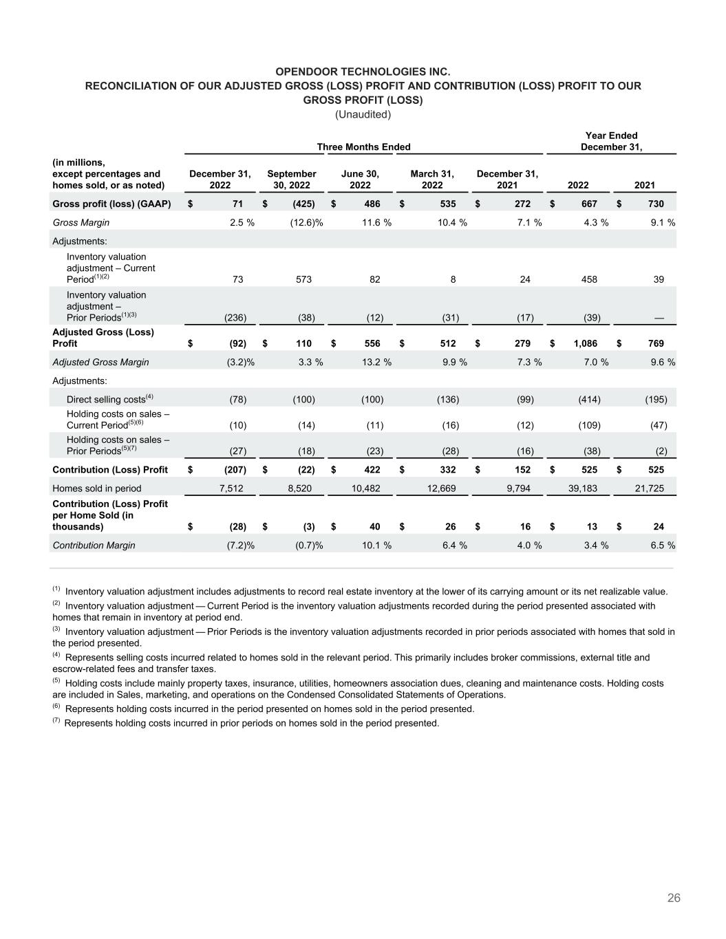 26 OPENDOOR TECHNOLOGIES INC. RECONCILIATION OF OUR ADJUSTED GROSS (LOSS) PROFIT AND CONTRIBUTION (LOSS) PROFIT TO OUR GROSS PROFIT (LOSS) (Unaudited) Three Months Ended Year Ended December 31, (in millions, except percentages and homes sold, or as noted) December 31, 2022 September 30, 2022 June 30, 2022 March 31, 2022 December 31, 2021 2022 2021 Gross profit (loss) (GAAP) $ 71 $ (425) $ 486 $ 535 $ 272 $ 667 $ 730 Gross Margin 2.5 % (12.6) % 11.6 % 10.4 % 7.1 % 4.3 % 9.1 % Adjustments: Inventory valuation adjustment – Current Period͏(1)(2) 73 573 82 8 24 458 39 Inventory valuation adjustment – Prior Periods͏(1)(3) (236) (38) (12) (31) (17) (39) — Adjusted Gross (Loss) Profit $ (92) $ 110 $ 556 $ 512 $ 279 $ 1,086 $ 769 Adjusted Gross Margin (3.2) % 3.3 % 13.2 % 9.9 % 7.3 % 7.0 % 9.6 % Adjustments: Direct selling costs(4) (78) (100) (100) (136) (99) (414) (195) Holding costs on sales – Current Period͏(5)(6) (10) (14) (11) (16) (12) (109) (47) Holding costs on sales – Prior Periods͏(5)(7) (27) (18) (23) (28) (16) (38) (2) Contribution (Loss) Profit $ (207) $ (22) $ 422 $ 332 $ 152 $ 525 $ 525 Homes sold in period 7,512 8,520 10,482 12,669 9,794 39,183 21,725 Contribution (Loss) Profit per Home Sold (in thousands) $ (28) $ (3) $ 40 $ 26 $ 16 $ 13 $ 24 Contribution Margin (7.2) % (0.7) % 10.1 % 6.4 % 4.0 % 3.4 % 6.5 % (1) Inventory valuation adjustment includes adjustments to record real estate inventory at the lower of its carrying amount or its net realizable value. (2) Inventory valuation adjustment — Current Period is the inventory valuation adjustments recorded during the period presented associated with homes that remain in inventory at period end. (3) Inventory valuation adjustment — Prior Periods is the inventory valuation adjustments recorded in prior periods associated with homes that sold in the period presented. (4) Represents selling costs incurred related to homes sold in the relevant period. This primarily includes broker commissions, external title and escrow-related fees and transfer taxes. (5) Holding costs include mainly property taxes, insurance, utilities, homeowners association dues, cleaning and maintenance costs. Holding costs are included in Sales, marketing, and operations on the Condensed Consolidated Statements of Operations. (6) Represents holding costs incurred in the period presented on homes sold in the period presented. (7) Represents holding costs incurred in prior periods on homes sold in the period presented.