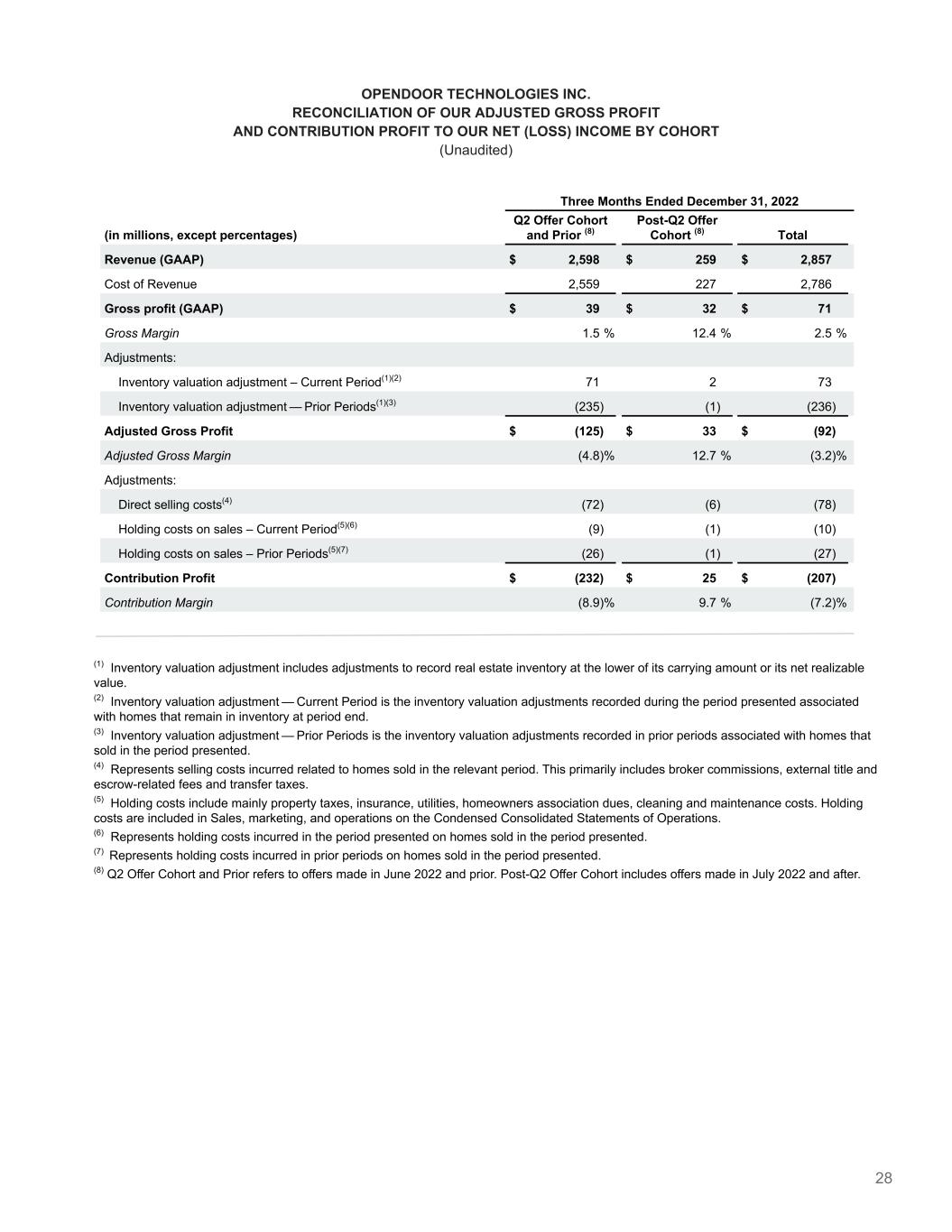 27 OPENDOOR TECHNOLOGIES INC. RECONCILIATION OF OUR ADJUSTED NET (LOSS) INCOME AND ADJUSTED EBITDA TO OUR NET (LOSS) INCOME (Unaudited) Three Months Ended Year Ended December 31, (in millions, except percentages) December 31, 2022 September 30, 2022 June 30, 2022 March 31, 2022 December 31, 2021 2022 2021 Net (loss) income (GAAP) $ (399) $ (928) $ (54) $ 28 $ (191) $ (1,353) $ (662) Adjustments: Stock-based compensation (7) 52 59 67 71 171 536 Equity securities fair value adjustment(1) (1) 11 3 22 16 35 (35) Warrant fair value adjustment͏(1) — — — — — — (12) Intangibles amortization expense(2) 2 2 3 2 2 9 4 Inventory valuation adjustment – Current Period͏(3)(4) 73 573 82 8 24 458 39 Inventory valuation adjustment  — Prior Periods͏(3)(5) (236) (38) (12) (31) (17) (39) — Restructuring(6) 17 — — — — 17 — Loss on extinguishment of debt 25 — — — — 25 — Gain on lease termination — — — — — — (5) Goodwill impairment 60 — — — — 60 — Payroll tax on initial RSU release — — — — — — 5 Legal contingency accrual and related expenses 1 — 42 3 14 46 14 Other(7) (2) — (1) — 1 (3) — Adjusted Net (Loss) Income $ (467) $ (328) $ 122 $ 99 $ (80) $ (574) $ (116) Adjustments: Depreciation and amortization, excluding amortization of intangibles and right of use assets 12 8 12 9 9 41 33 Property financing(8) 93 102 76 58 62 329 119 Other interest expense(9) 20 13 13 10 10 56 24 Interest income(10) (9) (7) (6) — (1) (22) (3) Income tax expense — 1 1 — — 2 1 Adjusted EBITDA $ (351) $ (211) $ 218 $ 176 $ 0.4 $ (168) $ 58 Adjusted EBITDA Margin (12.3) % (6.3) % 5.2 % 3.4 % — % (1.1) % 0.7 % (1) Represents the gains and losses on certain financial instruments, which are marked to fair value at the end of each period. (2) Represents amortization of acquisition-related intangible assets. The acquired intangible assets have useful lives ranging from 1 to 5 years and amortization is expected until the intangible assets are fully amortized. (3) Inventory valuation adjustment includes adjustments to record real estate inventory at the lower of its carrying amount or its net realizable value. (4) Inventory valuation adjustment — Current Period is the inventory valuation adjustments recorded during the period presented associated with homes that remain in inventory at period end. (5) Inventory valuation adjustment — Prior Periods is the inventory valuation adjustments recorded in prior periods associated with homes that sold in the period presented. (6) Restructuring costs consist mainly of employee termination benefits, relocation packages and bonuses as well as costs related to the exiting of certain non-cancelable leases. (7) Includes primarily gain or loss on interest rate lock commitments, gain or loss on the sale of available for sale securities, sublease income, and income from equity method investments. (8) Includes interest expense on our non-recourse asset-backed debt facilities. (9) Includes amortization of debt issuance costs and loan origination fees, commitment fees, unused fees, other interest related costs on our asset- backed debt facilities, interest expense related to the 2026 convertible senior notes outstanding, and interest expense on other secured borrowings. (10) Consists mainly of interest earned on cash, cash equivalents and marketable securities.
