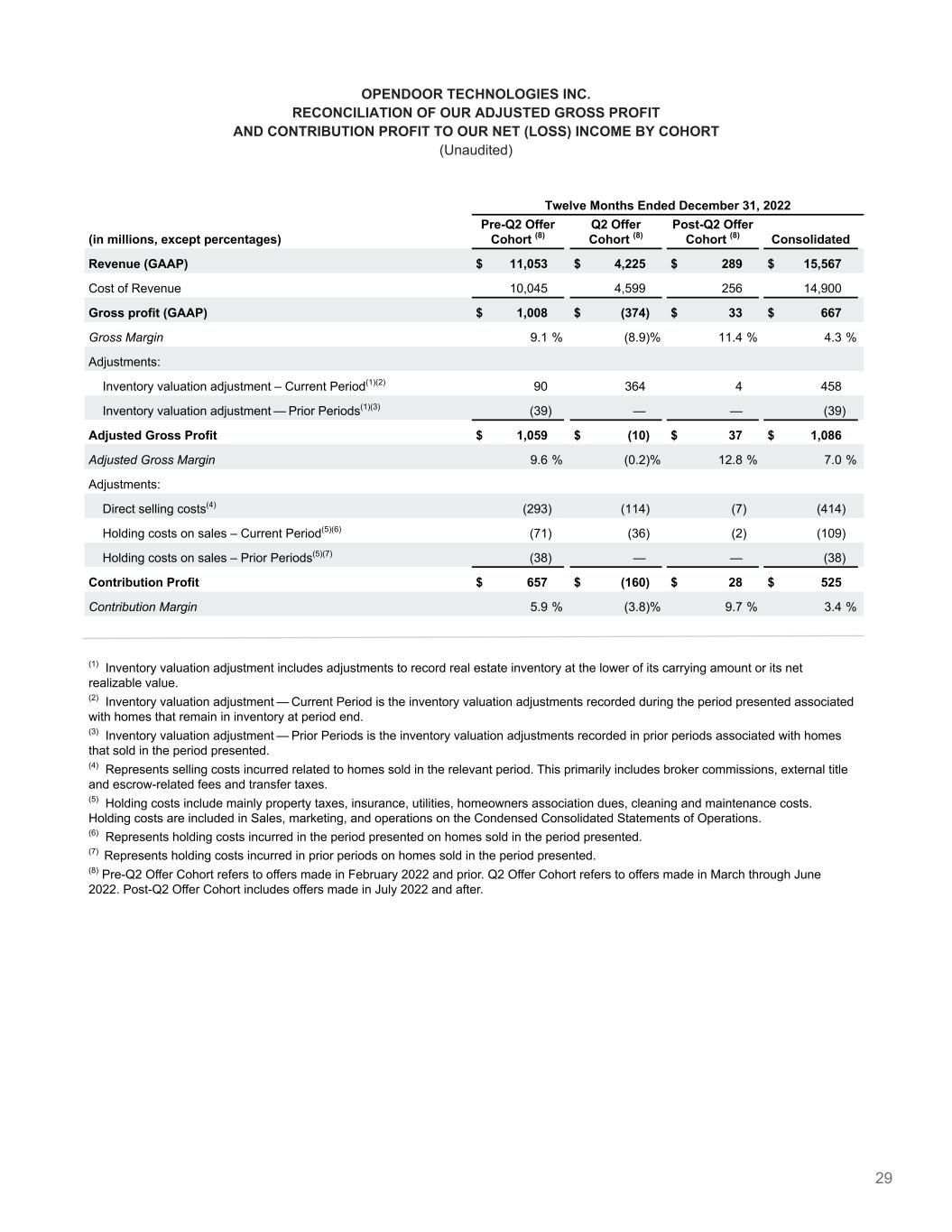 28 OPENDOOR TECHNOLOGIES INC. RECONCILIATION OF OUR ADJUSTED GROSS PROFIT AND CONTRIBUTION PROFIT TO OUR NET (LOSS) INCOME BY COHORT (Unaudited) Three Months Ended December 31, 2022 (in millions, except percentages) Q2 Offer Cohort and Prior (8) Post-Q2 Offer Cohort (8) Total Revenue (GAAP) $ 2,598 $ 259 $ 2,857 Cost of Revenue 2,559 227 2,786 Gross profit (GAAP) $ 39 $ 32 $ 71 Gross Margin 1.5 % 12.4 % 2.5 % Adjustments: Inventory valuation adjustment – Current Period͏(1)(2) 71 2 73 Inventory valuation adjustment — Prior Periods͏(1)(3) (235) (1) (236) Adjusted Gross Profit $ (125) $ 33 $ (92) Adjusted Gross Margin (4.8) % 12.7 % (3.2) % Adjustments: Direct selling costs(4) (72) (6) (78) Holding costs on sales – Current Period͏(5)(6) (9) (1) (10) Holding costs on sales – Prior Periods͏(5)(7) (26) (1) (27) Contribution Profit $ (232) $ 25 $ (207) Contribution Margin (8.9) % 9.7 % (7.2) % (1) Inventory valuation adjustment includes adjustments to record real estate inventory at the lower of its carrying amount or its net realizable value. (2) Inventory valuation adjustment — Current Period is the inventory valuation adjustments recorded during the period presented associated with homes that remain in inventory at period end. (3) Inventory valuation adjustment — Prior Periods is the inventory valuation adjustments recorded in prior periods associated with homes that sold in the period presented. (4) Represents selling costs incurred related to homes sold in the relevant period. This primarily includes broker commissions, external title and escrow-related fees and transfer taxes. (5) Holding costs include mainly property taxes, insurance, utilities, homeowners association dues, cleaning and maintenance costs. Holding costs are included in Sales, marketing, and operations on the Condensed Consolidated Statements of Operations. (6) Represents holding costs incurred in the period presented on homes sold in the period presented. (7) Represents holding costs incurred in prior periods on homes sold in the period presented. (8) Q2 Offer Cohort and Prior refers to offers made in June 2022 and prior. Post-Q2 Offer Cohort includes offers made in July 2022 and after.