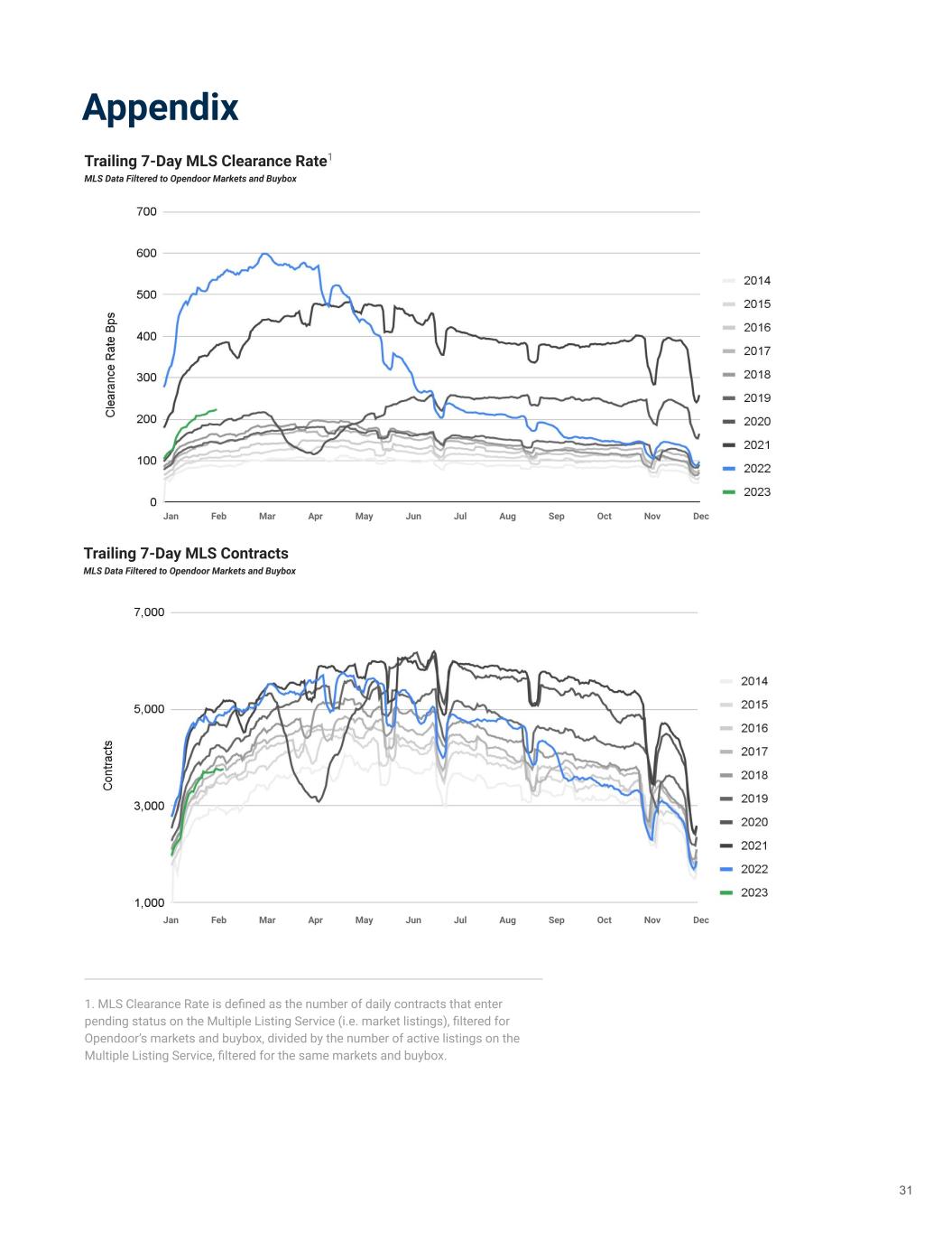 Appendix 1. MLS Clearance Rate is defined as the number of daily contracts that enter pending status on the Multiple Listing Service (i.e. market listings), filtered for Opendoor’s markets and buybox, divided by the number of active listings on the Multiple Listing Service, filtered for the same markets and buybox. Trailing 7-Day MLS Clearance Rate1 MLS Data Filtered to Opendoor Markets and Buybox Trailing 7-Day MLS Contracts MLS Data Filtered to Opendoor Markets and Buybox 2031 Jan Feb Mar Apr May Jun Jul Aug Sep Oct Nov Dec Jan Feb Mar Apr May Jun Jul Aug Sep Oct Nov Dec