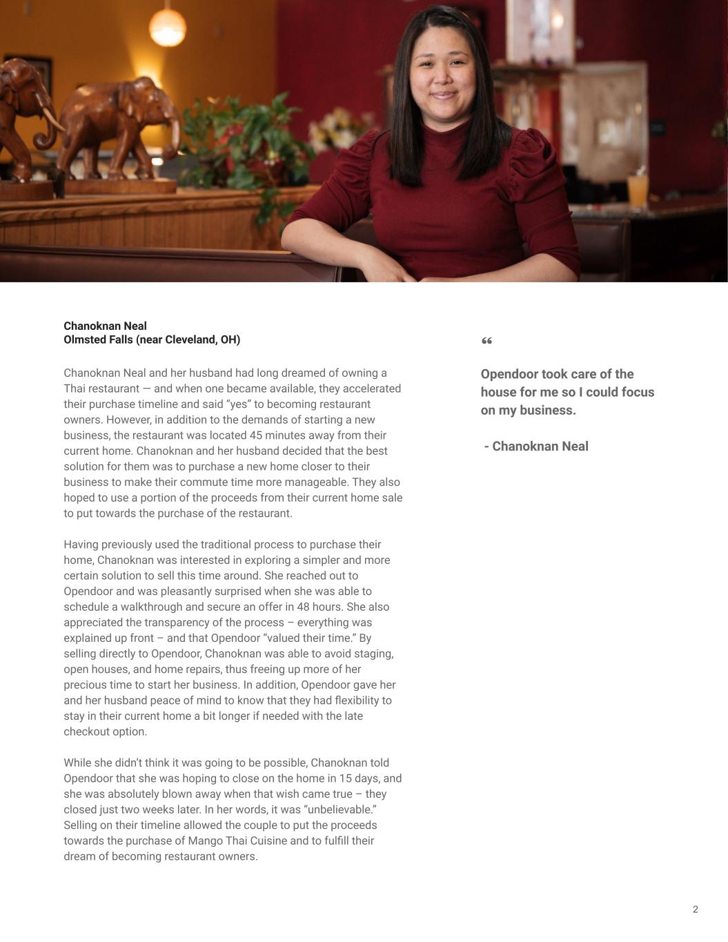 Chanoknan Neal Olmsted Falls (near Cleveland, OH) 2 Opendoor took care of the house for me so I could focus on my business. - Chanoknan Neal Chanoknan Neal and her husband had long dreamed of owning a Thai restaurant — and when one became available, they accelerated their purchase timeline and said “yes” to becoming restaurant owners. However, in addition to the demands of starting a new business, the restaurant was located 45 minutes away from their current home. Chanoknan and her husband decided that the best solution for them was to purchase a new home closer to their business to make their commute time more manageable. They also hoped to use a portion of the proceeds from their current home sale to put towards the purchase of the restaurant. Having previously used the traditional process to purchase their home, Chanoknan was interested in exploring a simpler and more certain solution to sell this time around. She reached out to Opendoor and was pleasantly surprised when she was able to schedule a walkthrough and secure an offer in 48 hours. She also appreciated the transparency of the process – everything was explained up front – and that Opendoor “valued their time.” By selling directly to Opendoor, Chanoknan was able to avoid staging, open houses, and home repairs, thus freeing up more of her precious time to start her business. In addition, Opendoor gave her and her husband peace of mind to know that they had flexibility to stay in their current home a bit longer if needed with the late checkout option. While she didn’t think it was going to be possible, Chanoknan told Opendoor that she was hoping to close on the home in 15 days, and she was absolutely blown away when that wish came true – they closed just two weeks later. In her words, it was “unbelievable.” Selling on their timeline allowed the couple to put the proceeds towards the purchase of Mango Thai Cuisine and to fulfill their dream of becoming restaurant owners.