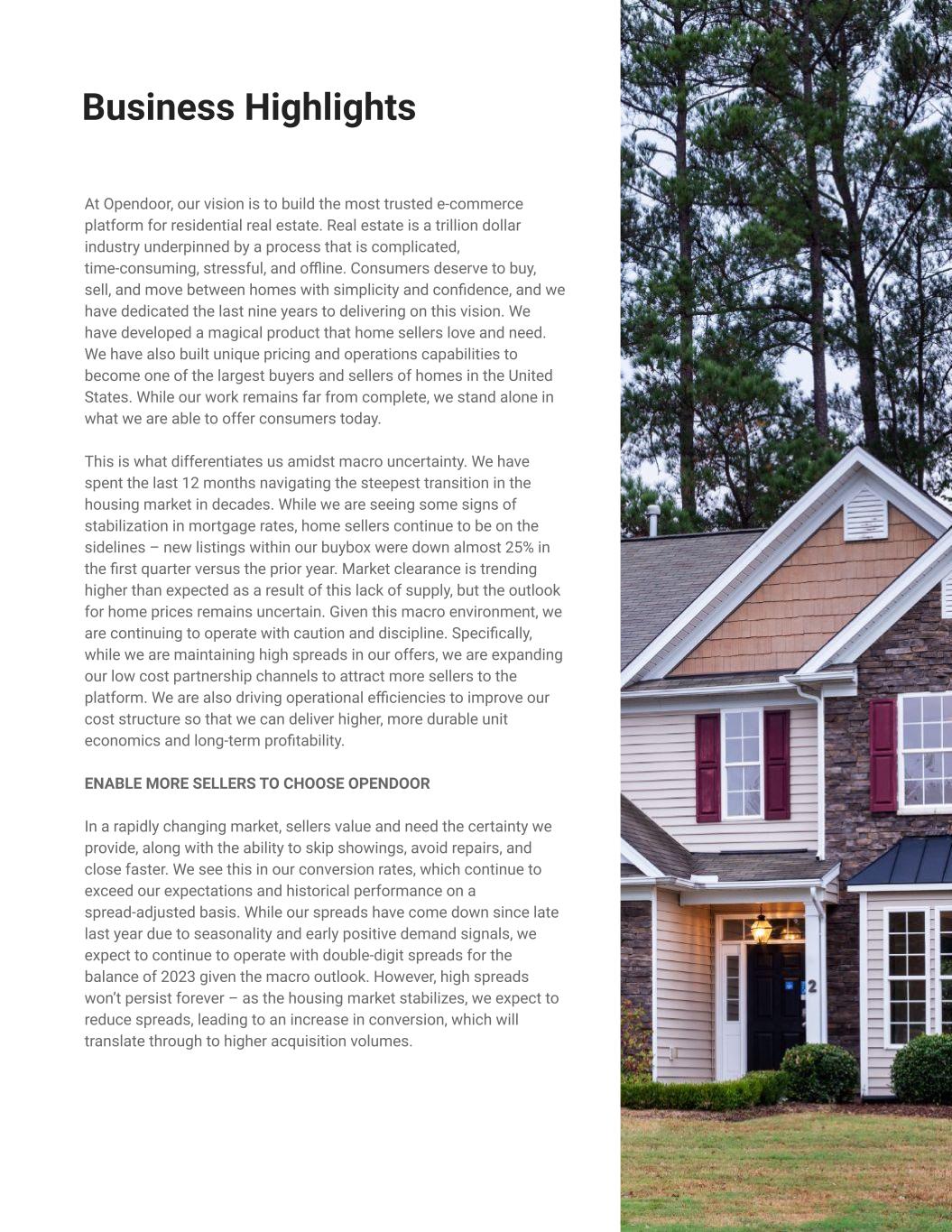 At Opendoor, our vision is to build the most trusted e-commerce platform for residential real estate. Real estate is a trillion dollar industry underpinned by a process that is complicated, time-consuming, stressful, and offline. Consumers deserve to buy, sell, and move between homes with simplicity and confidence, and we have dedicated the last nine years to delivering on this vision. We have developed a magical product that home sellers love and need. We have also built unique pricing and operations capabilities to become one of the largest buyers and sellers of homes in the United States. While our work remains far from complete, we stand alone in what we are able to offer consumers today. This is what differentiates us amidst macro uncertainty. We have spent the last 12 months navigating the steepest transition in the housing market in decades. While we are seeing some signs of stabilization in mortgage rates, home sellers continue to be on the sidelines – new listings within our buybox were down almost 25% in the first quarter versus the prior year. Market clearance is trending higher than expected as a result of this lack of supply, but the outlook for home prices remains uncertain. Given this macro environment, we are continuing to operate with caution and discipline. Specifically, while we are maintaining high spreads in our offers, we are expanding our low cost partnership channels to attract more sellers to the platform. We are also driving operational efficiencies to improve our cost structure so that we can deliver higher, more durable unit economics and long-term profitability. ENABLE MORE SELLERS TO CHOOSE OPENDOOR In a rapidly changing market, sellers value and need the certainty we provide, along with the ability to skip showings, avoid repairs, and close faster. We see this in our conversion rates, which continue to exceed our expectations and historical performance on a spread-adjusted basis. While our spreads have come down since late last year due to seasonality and early positive demand signals, we expect to continue to operate with double-digit spreads for the balance of 2023 given the macro outlook. However, high spreads won’t persist forever – as the housing market stabilizes, we expect to reduce spreads, leading to an increase in conversion, which will translate through to higher acquisition volumes. Two Core Product Offerings 1P product & 3P product 3 Business Highlights % of Q2 Offer Cohort Expected to be Sold or in Resale Contract by Year-End ~65%