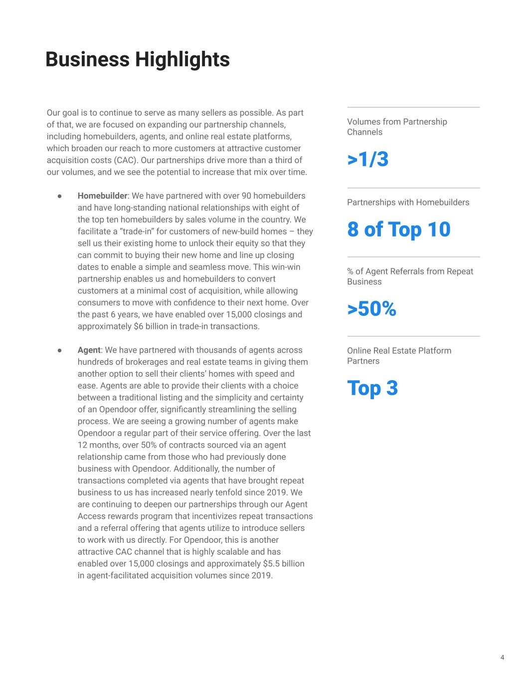 Our goal is to continue to serve as many sellers as possible. As part of that, we are focused on expanding our partnership channels, including homebuilders, agents, and online real estate platforms, which broaden our reach to more customers at attractive customer acquisition costs (CAC). Our partnerships drive more than a third of our volumes, and we see the potential to increase that mix over time. ● Homebuilder: We have partnered with over 90 homebuilders and have long-standing national relationships with eight of the top ten homebuilders by sales volume in the country. We facilitate a “trade-in” for customers of new-build homes – they sell us their existing home to unlock their equity so that they can commit to buying their new home and line up closing dates to enable a simple and seamless move. This win-win partnership enables us and homebuilders to convert customers at a minimal cost of acquisition, while allowing consumers to move with confidence to their next home. Over the past 6 years, we have enabled over 15,000 closings and approximately $6 billion in trade-in transactions. ● Agent: We have partnered with thousands of agents across hundreds of brokerages and real estate teams in giving them another option to sell their clients’ homes with speed and ease. Agents are able to provide their clients with a choice between a traditional listing and the simplicity and certainty of an Opendoor offer, significantly streamlining the selling process. We are seeing a growing number of agents make Opendoor a regular part of their service offering. Over the last 12 months, over 50% of contracts sourced via an agent relationship came from those who had previously done business with Opendoor. Additionally, the number of transactions completed via agents that have brought repeat business to us has increased nearly tenfold since 2019. We are continuing to deepen our partnerships through our Agent Access rewards program that incentivizes repeat transactions and a referral offering that agents utilize to introduce sellers to work with us directly. For Opendoor, this is another attractive CAC channel that is highly scalable and has enabled over 15,000 closings and approximately $5.5 billion in agent-facilitated acquisition volumes since 2019. 4 Business Highlights Partnerships with Homebuilders 8 of Top 10 % of Agent Referrals from Repeat Business >50% Online Real Estate Platform Partners Top 3 Volumes from Partnership Channels >1/3