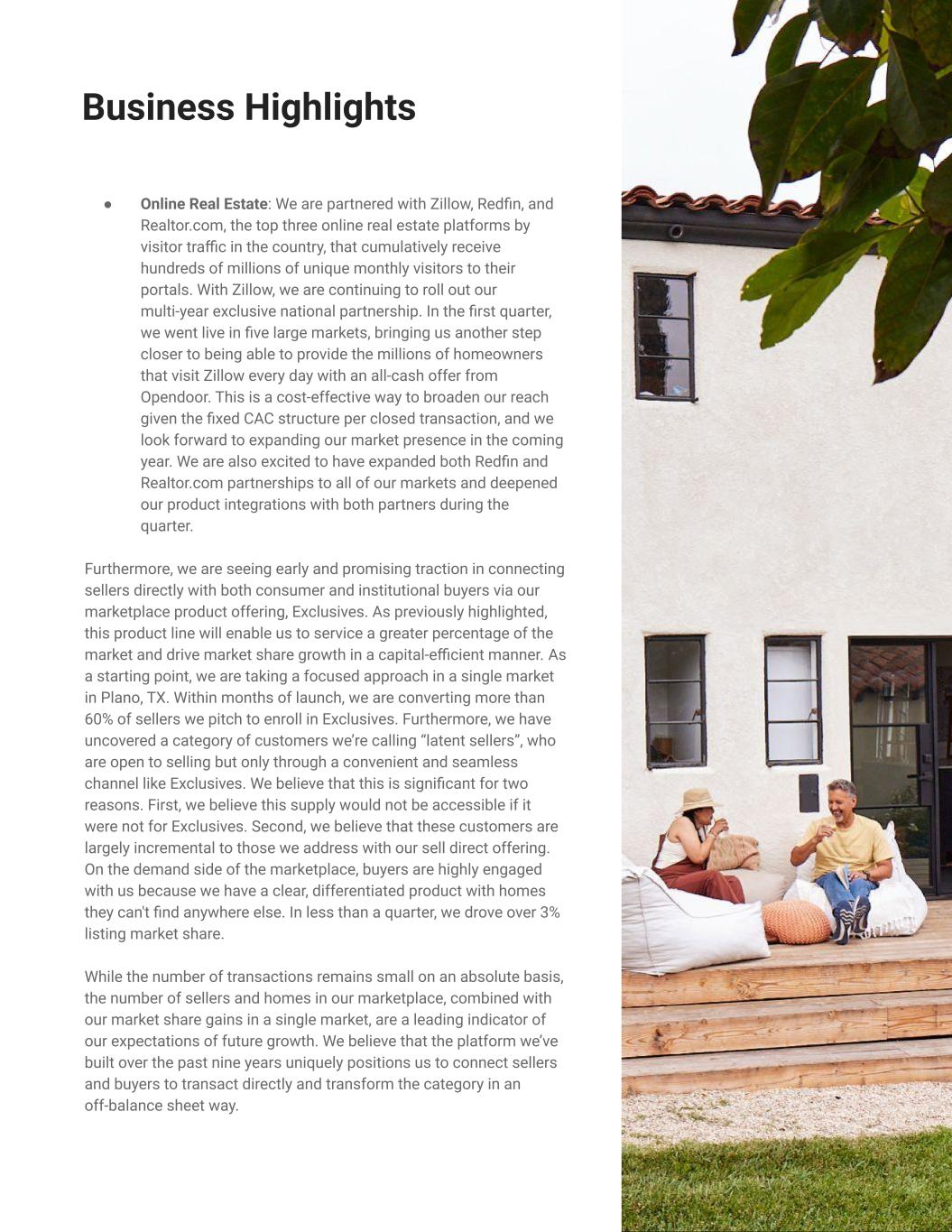 ● Online Real Estate: We are partnered with Zillow, Redfin, and Realtor.com, the top three online real estate platforms by visitor traffic in the country, that cumulatively receive hundreds of millions of unique monthly visitors to their portals. With Zillow, we are continuing to roll out our multi-year exclusive national partnership. In the first quarter, we went live in five large markets, bringing us another step closer to being able to provide the millions of homeowners that visit Zillow every day with an all-cash offer from Opendoor. This is a cost-effective way to broaden our reach given the fixed CAC structure per closed transaction, and we look forward to expanding our market presence in the coming year. We are also excited to have expanded both Redfin and Realtor.com partnerships to all of our markets and deepened our product integrations with both partners during the quarter. Furthermore, we are seeing early and promising traction in connecting sellers directly with both consumer and institutional buyers via our marketplace product offering, Exclusives. As previously highlighted, this product line will enable us to service a greater percentage of the market and drive market share growth in a capital-efficient manner. As a starting point, we are taking a focused approach in a single market in Plano, TX. Within months of launch, we are converting more than 60% of sellers we pitch to enroll in Exclusives. Furthermore, we have uncovered a category of customers we’re calling “latent sellers”, who are open to selling but only through a convenient and seamless channel like Exclusives. We believe that this is significant for two reasons. First, we believe this supply would not be accessible if it were not for Exclusives. Second, we believe that these customers are largely incremental to those we address with our sell direct offering. On the demand side of the marketplace, buyers are highly engaged with us because we have a clear, differentiated product with homes they can't find anywhere else. In less than a quarter, we drove over 3% listing market share. While the number of transactions remains small on an absolute basis, the number of sellers and homes in our marketplace, combined with our market share gains in a single market, are a leading indicator of our expectations of future growth. We believe that the platform we’ve built over the past nine years uniquely positions us to connect sellers and buyers to transact directly and transform the category in an off-balance sheet way. 5 Business Highlights List with Certainty