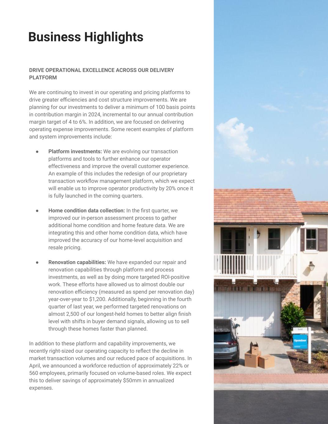 DRIVE OPERATIONAL EXCELLENCE ACROSS OUR DELIVERY PLATFORM We are continuing to invest in our operating and pricing platforms to drive greater efficiencies and cost structure improvements. We are planning for our investments to deliver a minimum of 100 basis points in contribution margin in 2024, incremental to our annual contribution margin target of 4 to 6%. In addition, we are focused on delivering operating expense improvements. Some recent examples of platform and system improvements include: ● Platform investments: We are evolving our transaction platforms and tools to further enhance our operator effectiveness and improve the overall customer experience. An example of this includes the redesign of our proprietary transaction workflow management platform, which we expect will enable us to improve operator productivity by 20% once it is fully launched in the coming quarters. ● Home condition data collection: In the first quarter, we improved our in-person assessment process to gather additional home condition and home feature data. We are integrating this and other home condition data, which have improved the accuracy of our home-level acquisition and resale pricing. ● Renovation capabilities: We have expanded our repair and renovation capabilities through platform and process investments, as well as by doing more targeted ROI-positive work. These efforts have allowed us to almost double our renovation efficiency (measured as spend per renovation day) year-over-year to $1,200. Additionally, beginning in the fourth quarter of last year, we performed targeted renovations on almost 2,500 of our longest-held homes to better align finish level with shifts in buyer demand signals, allowing us to sell through these homes faster than planned. In addition to these platform and capability improvements, we recently right-sized our operating capacity to reflect the decline in market transaction volumes and our reduced pace of acquisitions. In April, we announced a workforce reduction of approximately 22% or 560 employees, primarily focused on volume-based roles. We expect this to deliver savings of approximately $50mm in annualized expenses. 6 Expected Margin Improvement in 2024 via Increased Efficiencies Business Highlights >100 bps