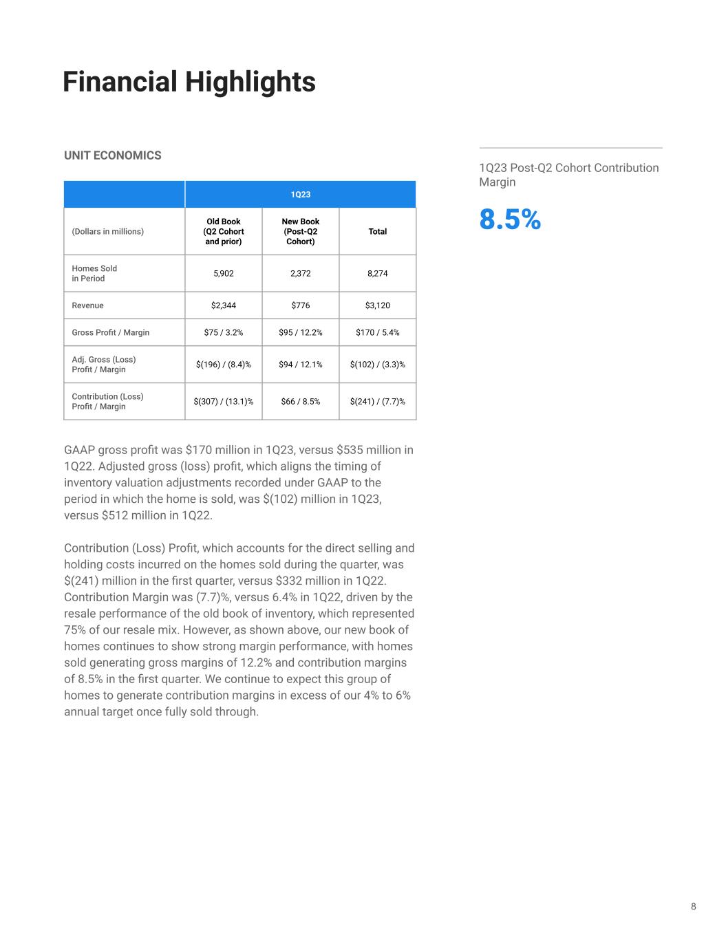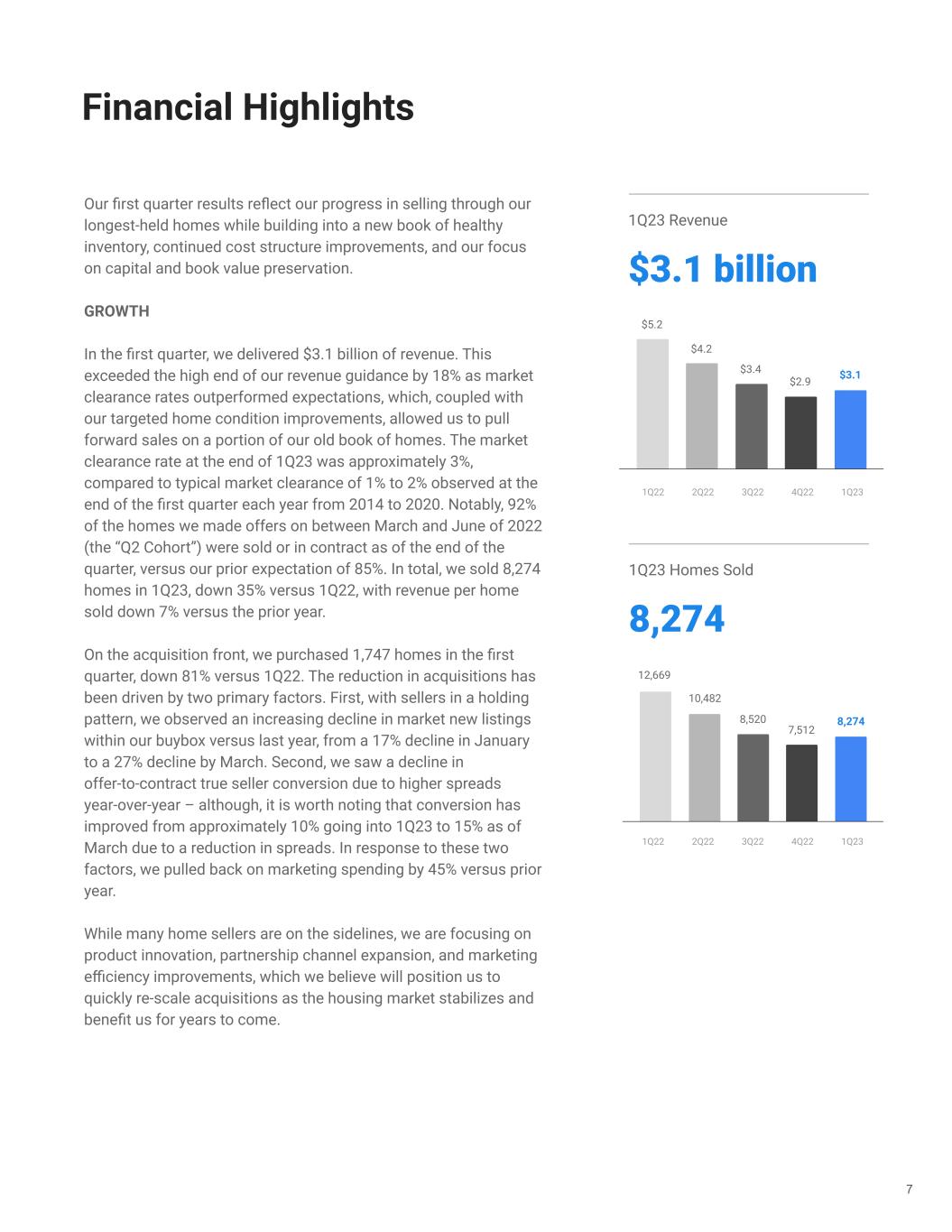 Our first quarter results reflect our progress in selling through our longest-held homes while building into a new book of healthy inventory, continued cost structure improvements, and our focus on capital and book value preservation. GROWTH In the first quarter, we delivered $3.1 billion of revenue. This exceeded the high end of our revenue guidance by 18% as market clearance rates outperformed expectations, which, coupled with our targeted home condition improvements, allowed us to pull forward sales on a portion of our old book of homes. The market clearance rate at the end of 1Q23 was approximately 3%, compared to typical market clearance of 1% to 2% observed at the end of the first quarter each year from 2014 to 2020. Notably, 92% of the homes we made offers on between March and June of 2022 (the “Q2 Cohort”) were sold or in contract as of the end of the quarter, versus our prior expectation of 85%. In total, we sold 8,274 homes in 1Q23, down 35% versus 1Q22, with revenue per home sold down 7% versus the prior year. On the acquisition front, we purchased 1,747 homes in the first quarter, down 81% versus 1Q22. The reduction in acquisitions has been driven by two primary factors. First, with sellers in a holding pattern, we observed an increasing decline in market new listings within our buybox versus last year, from a 17% decline in January to a 27% decline by March. Second, we saw a decline in offer-to-contract true seller conversion due to higher spreads year-over-year – although, it is worth noting that conversion has improved from approximately 10% going into 1Q23 to 15% as of March due to a reduction in spreads. In response to these two factors, we pulled back on marketing spending by 45% versus prior year. While many home sellers are on the sidelines, we are focusing on product innovation, partnership channel expansion, and marketing efficiency improvements, which we believe will position us to quickly re-scale acquisitions as the housing market stabilizes and benefit us for years to come. 7 Financial Highlights 1Q23 Revenue $3.1 billion 1Q23 Homes Sold 8,274 8,520 12,669 10,482 8,274 7,512 1Q22 2Q22 3Q22 4Q22 1Q23 $3.4 $5.2 $4.2 $3.1$2.9 1Q22 2Q22 3Q22 4Q22 1Q23