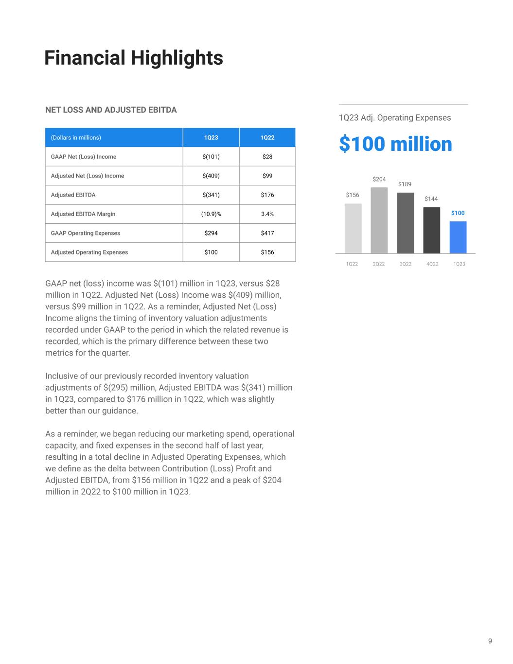 NET LOSS AND ADJUSTED EBITDA GAAP net (loss) income was $(101) million in 1Q23, versus $28 million in 1Q22. Adjusted Net (Loss) Income was $(409) million, versus $99 million in 1Q22. As a reminder, Adjusted Net (Loss) Income aligns the timing of inventory valuation adjustments recorded under GAAP to the period in which the related revenue is recorded, which is the primary difference between these two metrics for the quarter. Inclusive of our previously recorded inventory valuation adjustments of $(295) million, Adjusted EBITDA was $(341) million in 1Q23, compared to $176 million in 1Q22, which was slightly better than our guidance. As a reminder, we began reducing our marketing spend, operational capacity, and fixed expenses in the second half of last year, resulting in a total decline in Adjusted Operating Expenses, which we define as the delta between Contribution (Loss) Profit and Adjusted EBITDA, from $156 million in 1Q22 and a peak of $204 million in 2Q22 to $100 million in 1Q23. 9 Financial Highlights (Dollars in millions) 1Q23 1Q22 GAAP Net (Loss) Income $(101) $28 Adjusted Net (Loss) Income $(409) $99 Adjusted EBITDA $(341) $176 Adjusted EBITDA Margin (10.9)% 3.4% GAAP Operating Expenses $294 $417 Adjusted Operating Expenses $100 $156 1Q23 Adj. Operating Expenses $100 million $189 $156 $204 $100 $144 1Q22 2Q22 3Q22 4Q22 1Q23