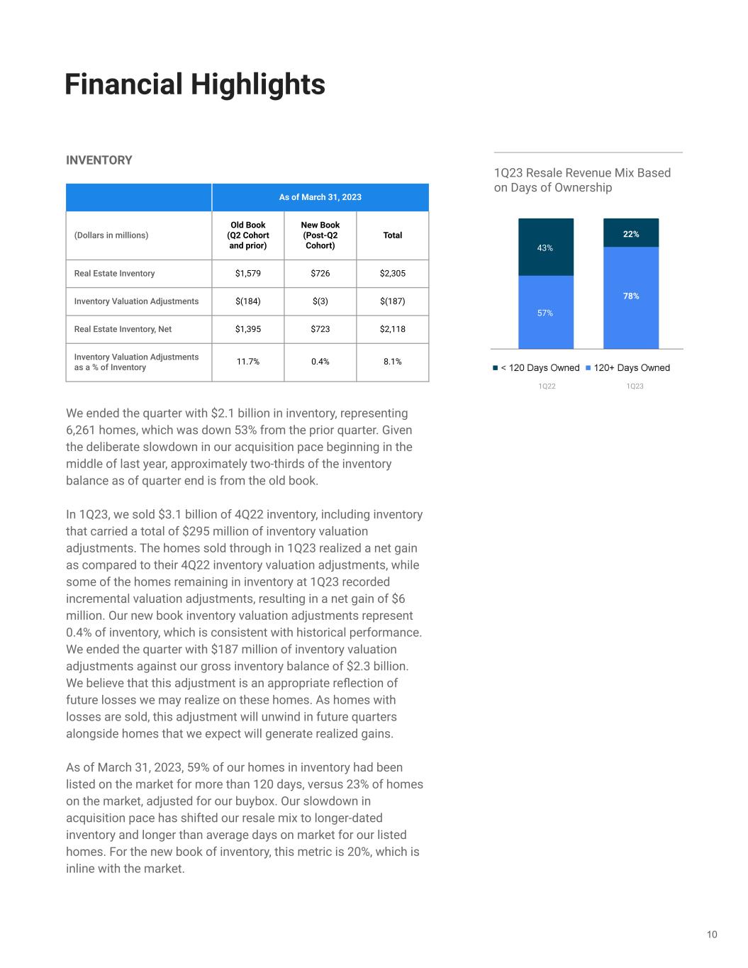 UNIT ECONOMICS GAAP gross profit was $170 million in 1Q23, versus $535 million in 1Q22. Adjusted gross (loss) profit, which aligns the timing of inventory valuation adjustments recorded under GAAP to the period in which the home is sold, was $(102) million in 1Q23, versus $512 million in 1Q22. Contribution (Loss) Profit, which accounts for the direct selling and holding costs incurred on the homes sold during the quarter, was $(241) million in the first quarter, versus $332 million in 1Q22. Contribution Margin was (7.7)%, versus 6.4% in 1Q22, driven by the resale performance of the old book of inventory, which represented 75% of our resale mix. However, as shown above, our new book of homes continues to show strong margin performance, with homes sold generating gross margins of 12.2% and contribution margins of 8.5% in the first quarter. We continue to expect this group of homes to generate contribution margins in excess of our 4% to 6% annual target once fully sold through. 8 Financial Highlights 1Q23 Post-Q2 Cohort Contribution Margin 8.5% 1Q23 (Dollars in millions) Old Book (Q2 Cohort and prior) New Book (Post-Q2 Cohort) Total Homes Sold in Period 5,902 2,372 8,274 Revenue $2,344 $776 $3,120 Gross Profit / Margin $75 / 3.2% $95 / 12.2% $170 / 5.4% Adj. Gross (Loss) Profit / Margin $(196) / (8.4)% $94 / 12.1% $(102) / (3.3)% Contribution (Loss) Profit / Margin $(307) / (13.1)% $66 / 8.5% $(241) / (7.7)%