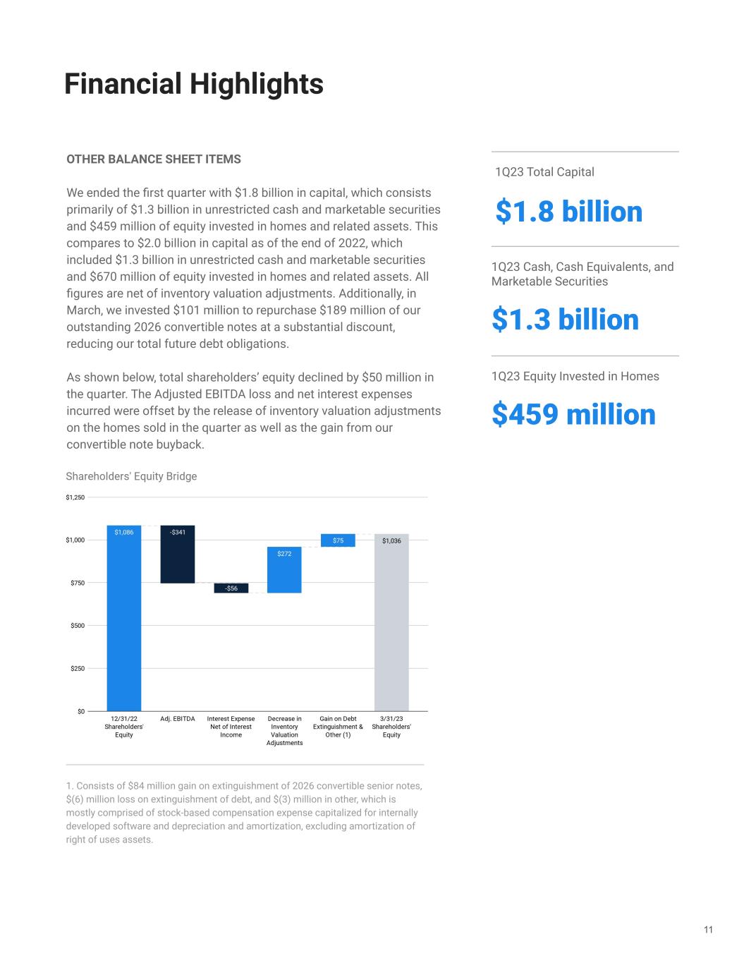 Financial Highlights OTHER BALANCE SHEET ITEMS We ended the first quarter with $1.8 billion in capital, which consists primarily of $1.3 billion in unrestricted cash and marketable securities and $459 million of equity invested in homes and related assets. This compares to $2.0 billion in capital as of the end of 2022, which included $1.3 billion in unrestricted cash and marketable securities and $670 million of equity invested in homes and related assets. All figures are net of inventory valuation adjustments. Additionally, in March, we invested $101 million to repurchase $189 million of our outstanding 2026 convertible notes at a substantial discount, reducing our total future debt obligations. As shown below, total shareholders’ equity declined by $50 million in the quarter. The Adjusted EBITDA loss and net interest expenses incurred were offset by the release of inventory valuation adjustments on the homes sold in the quarter as well as the gain from our convertible note buyback. 11 1. Consists of $84 million gain on extinguishment of 2026 convertible senior notes, $(6) million loss on extinguishment of debt, and $(3) million in other, which is mostly comprised of stock-based compensation expense capitalized for internally developed software and depreciation and amortization, excluding amortization of right of uses assets. 1Q23 Total Capital $1.8 billion 1Q23 Cash, Cash Equivalents, and Marketable Securities $1.3 billion 1Q23 Equity Invested in Homes $459 million