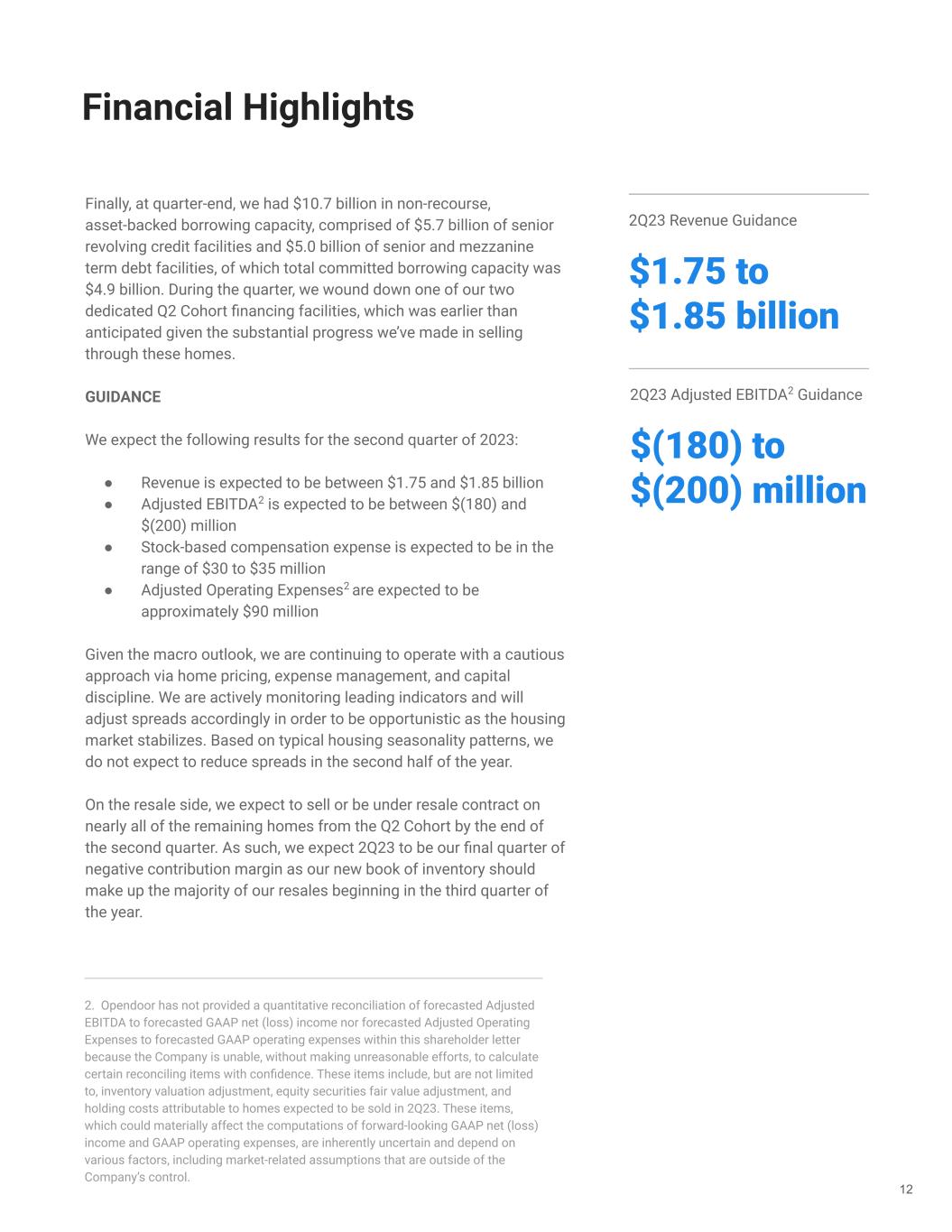 Financial Highlights 12 Finally, at quarter-end, we had $10.7 billion in non-recourse, asset-backed borrowing capacity, comprised of $5.7 billion of senior revolving credit facilities and $5.0 billion of senior and mezzanine term debt facilities, of which total committed borrowing capacity was $4.9 billion. During the quarter, we wound down one of our two dedicated Q2 Cohort financing facilities, which was earlier than anticipated given the substantial progress we’ve made in selling through these homes. GUIDANCE We expect the following results for the second quarter of 2023: ● Revenue is expected to be between $1.75 and $1.85 billion ● Adjusted EBITDA2 is expected to be between $(180) and $(200) million ● Stock-based compensation expense is expected to be in the range of $30 to $35 million ● Adjusted Operating Expenses2 are expected to be approximately $90 million Given the macro outlook, we are continuing to operate with a cautious approach via home pricing, expense management, and capital discipline. We are actively monitoring leading indicators and will adjust spreads accordingly in order to be opportunistic as the housing market stabilizes. Based on typical housing seasonality patterns, we do not expect to reduce spreads in the second half of the year. On the resale side, we expect to sell or be under resale contract on nearly all of the remaining homes from the Q2 Cohort by the end of the second quarter. As such, we expect 2Q23 to be our final quarter of negative contribution margin as our new book of inventory should make up the majority of our resales beginning in the third quarter of the year. 2. Opendoor has not provided a quantitative reconciliation of forecasted Adjusted EBITDA to forecasted GAAP net (loss) income nor forecasted Adjusted Operating Expenses to forecasted GAAP operating expenses within this shareholder letter because the Company is unable, without making unreasonable efforts, to calculate certain reconciling items with confidence. These items include, but are not limited to, inventory valuation adjustment, equity securities fair value adjustment, and holding costs attributable to homes expected to be sold in 2Q23. These items, which could materially affect the computations of forward-looking GAAP net (loss) income and GAAP operating expenses, are inherently uncertain and depend on various factors, including market-related assumptions that are outside of the Company’s control. 2Q23 Revenue Guidance $1.75 to $1.85 billion 2Q23 Adjusted EBITDA2 Guidance $(180) to $(200) million