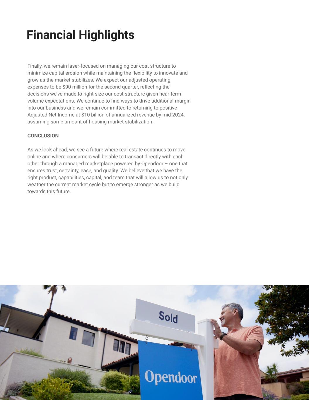 13 Financial Highlights Finally, we remain laser-focused on managing our cost structure to minimize capital erosion while maintaining the flexibility to innovate and grow as the market stabilizes. We expect our adjusted operating expenses to be $90 million for the second quarter, reflecting the decisions we’ve made to right-size our cost structure given near-term volume expectations. We continue to find ways to drive additional margin into our business and we remain committed to returning to positive Adjusted Net Income at $10 billion of annualized revenue by mid-2024, assuming some amount of housing market stabilization. CONCLUSION As we look ahead, we see a future where real estate continues to move online and where consumers will be able to transact directly with each other through a managed marketplace powered by Opendoor – one that ensures trust, certainty, ease, and quality. We believe that we have the right product, capabilities, capital, and team that will allow us to not only weather the current market cycle but to emerge stronger as we build towards this future.