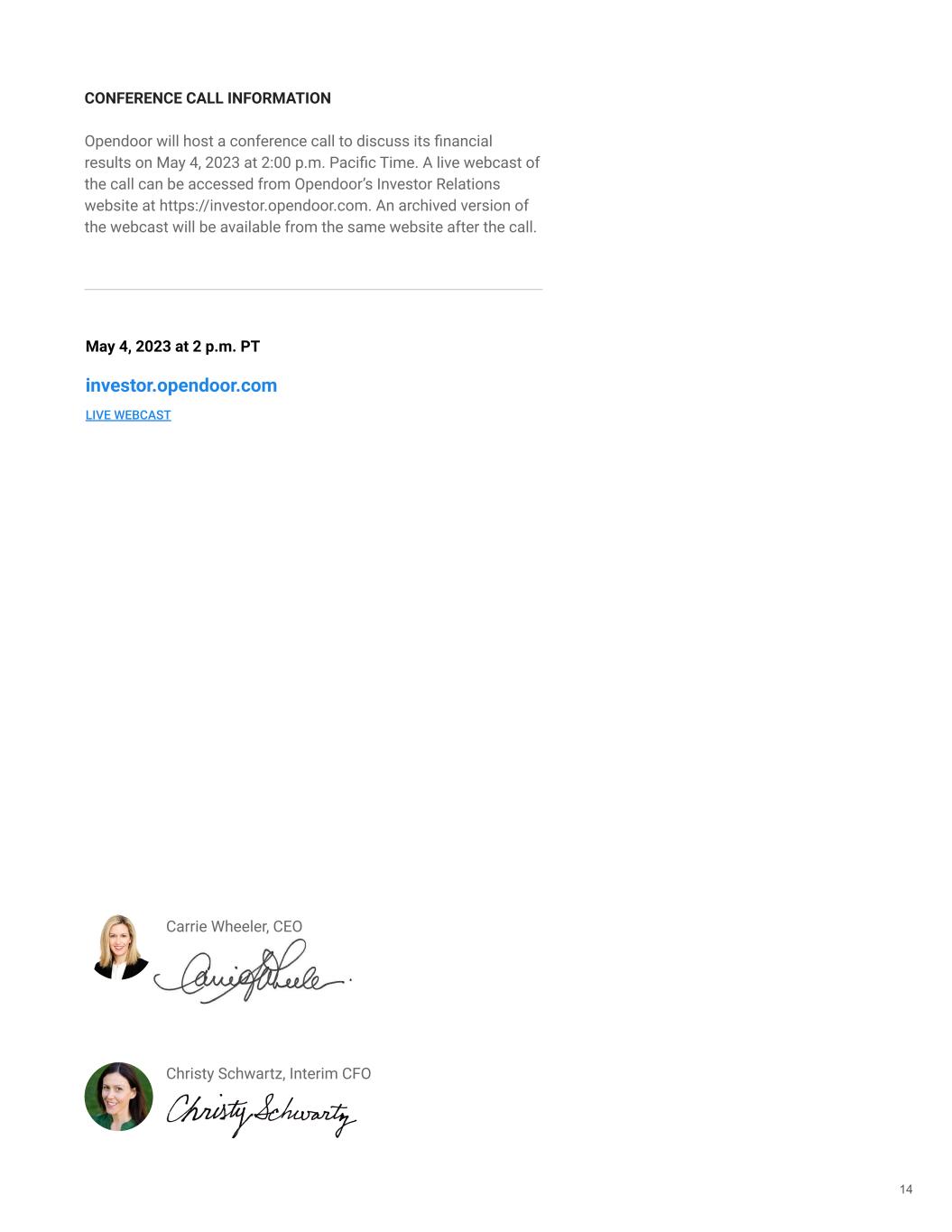 14Raleigh-Durham, NC Carrie Wheeler, CEO Christy Schwartz, Interim CFO CONFERENCE CALL INFORMATION Opendoor will host a conference call to discuss its financial results on May 4, 2023 at 2:00 p.m. Pacific Time. A live webcast of the call can be accessed from Opendoor’s Investor Relations website at https://investor.opendoor.com. An archived version of the webcast will be available from the same website after the call. May 4, 2023 at 2 p.m. PT investor.opendoor.com LIVE WEBCAST