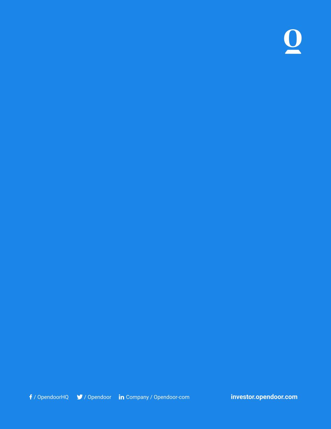 Use of Non-GAAP Financial Measures To provide investors with additional information regarding the Company’s financial results, this shareholder letter includes references to certain non-GAAP financial measures that are used by management. The Company believes these non-GAAP financial measures including Adjusted Gross (Loss) Profit, Contribution (Loss) Profit, Adjusted Net (Loss) Income, Adjusted EBITDA, and any such non-GAAP financial measures expressed as a Margin, are useful to investors as supplemental operational measurements to evaluate the Company’s financial performance. The non-GAAP financial measures should not be considered in isolation or as a substitute for the Company’s reported GAAP results because they may include or exclude certain items as compared to similar GAAP-based measures, and such measures may not be comparable to similarly-titled measures reported by other companies. Management uses these non- GAAP financial measures for financial and operational decision-making and as a means to evaluate period-to-period comparisons. Management believes that these non-GAAP financial measures provide meaningful supplemental information regarding the Company’s performance by excluding certain items that may not be indicative of the Company’s recurring operating results. Adjusted Gross (Loss) Profit and Contribution (Loss) Profit To provide investors with additional information regarding our margins and return on inventory acquired, we have included Adjusted Gross (Loss) Profit and Contribution (Loss) Profit, which are non-GAAP financial measures. We believe that Adjusted Gross (Loss) Profit and Contribution (Loss) Profit are useful financial measures for investors as they are supplemental measures used by management in evaluating unit level economics and our operating performance. Each of these measures is intended to present the economics related to homes sold during a given period. We do so by including revenue generated from homes sold (and adjacent services) in the period and only the expenses that are directly attributable to such home sales, even if such expenses were recognized in prior periods, and excluding expenses related to homes that remain in inventory as of the end of the period. Contribution (Loss) Profit provides investors a measure to assess Opendoor’s ability to generate returns on homes sold during a reporting period after considering home purchase costs, renovation and repair costs, holding costs and selling costs. Adjusted Gross (Loss) Profit and Contribution (Loss) Profit are supplemental measures of our operating performance and have limitations as analytical tools. For example, these measures include costs that were recorded in prior periods under GAAP and exclude, in connection with homes held in inventory at the end of the period, costs required to be recorded under GAAP in the same period. Accordingly, these measures should not be considered in isolation or as a substitute for analysis of our results as reported under GAAP. We include a reconciliation of these measures to the most directly comparable GAAP financial measure, which is gross (loss) profit. 18 Definitions