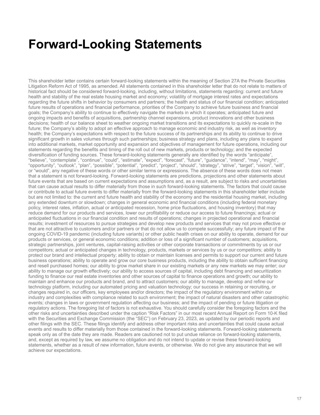 This shareholder letter contains certain forward-looking statements within the meaning of Section 27A the Private Securities Litigation Reform Act of 1995, as amended. All statements contained in this shareholder letter that do not relate to matters of historical fact should be considered forward-looking, including, without limitations, statements regarding: current and future health and stability of the real estate housing market and economy; volatility of mortgage interest rates and expectations regarding the future shifts in behavior by consumers and partners; the health and status of our financial condition; anticipated future results of operations and financial performance, priorities of the Company to achieve future business and financial goals; the Company’s ability to continue to effectively navigate the markets in which it operates; anticipated future and ongoing impacts and benefits of acquisitions, partnership channel expansions, product innovations and other business decisions; health of our balance sheet to weather ongoing market transitions and its expectations to quickly re-scale in the future; the Company’s ability to adopt an effective approach to manage economic and industry risk, as well as inventory health; the Company’s expectations with respect to the future success of its partnerships and its ability to continue to drive significant growth in sales volumes through such partnerships; business strategy and plans, including any plans to expand into additional markets, market opportunity and expansion and objectives of management for future operations, including our statements regarding the benefits and timing of the roll out of new markets, products or technology; and the expected diversification of funding sources. These forward-looking statements generally are identified by the words “anticipate”, “believe”, “contemplate”, “continue”, “could”, “estimate”, “expect”, “forecast”, “future”, “guidance”, “intend”, “may”, “might”, “opportunity”, “outlook”, “plan”, “possible”, “potential”, “predict”, “project”, “should”, “strategy”, “strive”, “target”, “vision”, “will”, or “would”, any negative of these words or other similar terms or expressions. The absence of these words does not mean that a statement is not forward-looking. Forward-looking statements are predictions, projections and other statements about future events that are based on current expectations and assumptions and, as a result, are subject to risks and uncertainties that can cause actual results to differ materially from those in such forward-looking statements. The factors that could cause or contribute to actual future events to differ materially from the forward-looking statements in this shareholder letter include but are not limited to: the current and future health and stability of the economy and the residential housing market, including any extended downturn or slowdown; changes in general economic and financial conditions (including federal monetary policy, interest rates, inflation, actual or anticipated recession, home price fluctuations, and housing inventory) that may reduce demand for our products and services, lower our profitability or reduce our access to future financings; actual or anticipated fluctuations in our financial condition and results of operations; changes in projected operational and financial results; investment of resources to pursue strategies and develop new products and services that may not prove effective or that are not attractive to customers and/or partners or that do not allow us to compete successfully; any future impact of the ongoing COVID-19 pandemic (including future variants) or other public health crises on our ability to operate, demand for our products or services, or general economic conditions; addition or loss of a significant number of customers; acquisitions, strategic partnerships, joint ventures, capital-raising activities or other corporate transactions or commitments by us or our competitors; actual or anticipated changes in technology, products, markets or services by us or our competitors; ability to protect our brand and intellectual property; ability to obtain or maintain licenses and permits to support our current and future business operations; ability to operate and grow our core business products, including the ability to obtain sufficient financing and resell purchased homes; our ability to grow market share in our existing markets or any new markets we may enter; our ability to manage our growth effectively; our ability to access sources of capital, including debt financing and securitization funding to finance our real estate inventories and other sources of capital to finance operations and growth; our ability to maintain and enhance our products and brand, and to attract customers; our ability to manage, develop and refine our technology platform, including our automated pricing and valuation technology; our success in retaining or recruiting, or changes required in, our officers, key employees and/or directors; the impact of the regulatory environment within our industry and complexities with compliance related to such environment; the impact of natural disasters and other catastrophic events; changes in laws or government regulation affecting our business; and the impact of pending or future litigation or regulatory actions. The foregoing list of factors is not exhaustive. You should carefully consider the foregoing factors and the other risks and uncertainties described under the caption “Risk Factors” in our most recent Annual Report on Form 10-K filed with the Securities and Exchange Commission (the “SEC”) on February 23, 2023, as updated by our periodic reports and other filings with the SEC. These filings identify and address other important risks and uncertainties that could cause actual events and results t