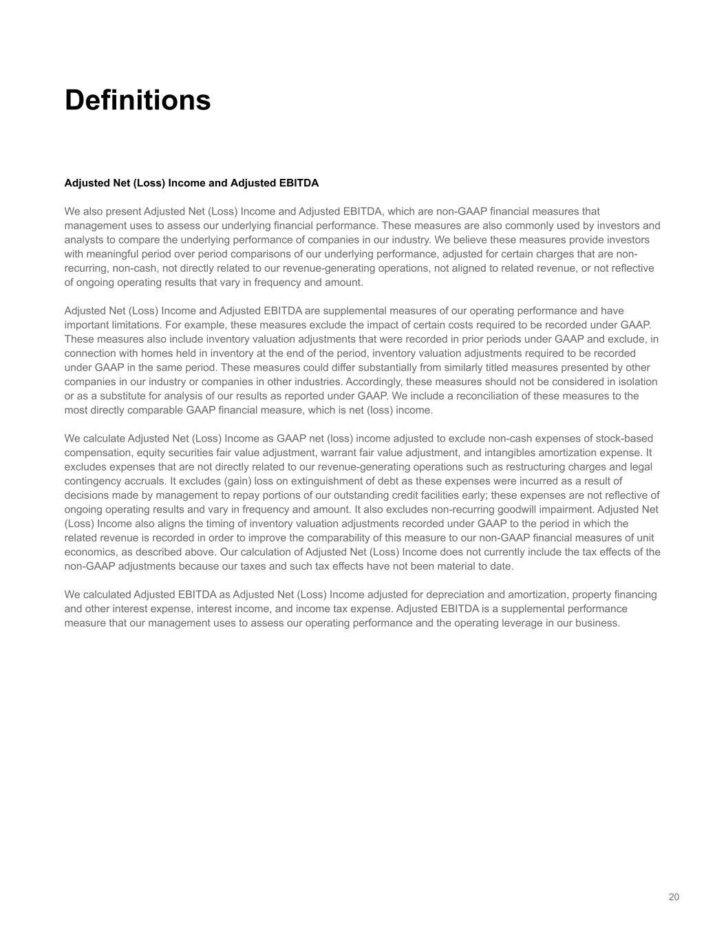 20 Adjusted Net (Loss) Income and Adjusted EBITDA We also present Adjusted Net (Loss) Income and Adjusted EBITDA, which are non-GAAP financial measures that management uses to assess our underlying financial performance. These measures are also commonly used by investors and analysts to compare the underlying performance of companies in our industry. We believe these measures provide investors with meaningful period over period comparisons of our underlying performance, adjusted for certain charges that are non- recurring, non-cash, not directly related to our revenue-generating operations, not aligned to related revenue, or not reflective of ongoing operating results that vary in frequency and amount. Adjusted Net (Loss) Income and Adjusted EBITDA are supplemental measures of our operating performance and have important limitations. For example, these measures exclude the impact of certain costs required to be recorded under GAAP. These measures also include inventory valuation adjustments that were recorded in prior periods under GAAP and exclude, in connection with homes held in inventory at the end of the period, inventory valuation adjustments required to be recorded under GAAP in the same period. These measures could differ substantially from similarly titled measures presented by other companies in our industry or companies in other industries. Accordingly, these measures should not be considered in isolation or as a substitute for analysis of our results as reported under GAAP. We include a reconciliation of these measures to the most directly comparable GAAP financial measure, which is net (loss) income. We calculate Adjusted Net (Loss) Income as GAAP net (loss) income adjusted to exclude non-cash expenses of stock-based compensation, equity securities fair value adjustment, warrant fair value adjustment, and intangibles amortization expense. It excludes expenses that are not directly related to our revenue-generating operations such as restructuring charges and legal contingency accruals. It excludes (gain) loss on extinguishment of debt as these expenses were incurred as a result of decisions made by management to repay portions of our outstanding credit facilities early; these expenses are not reflective of ongoing operating results and vary in frequency and amount. It also excludes non-recurring goodwill impairment. Adjusted Net (Loss) Income also aligns the timing of inventory valuation adjustments recorded under GAAP to the period in which the related revenue is recorded in order to improve the comparability of this measure to our non-GAAP financial measures of unit economics, as described above. Our calculation of Adjusted Net (Loss) Income does not currently include the tax effects of the non-GAAP adjustments because our taxes and such tax effects have not been material to date. We calculated Adjusted EBITDA as Adjusted Net (Loss) Income adjusted for depreciation and amortization, property financing and other interest expense, interest income, and income tax expense. Adjusted EBITDA is a supplemental performance measure that our management uses to assess our operating performance and the operating leverage in our business. Definitions