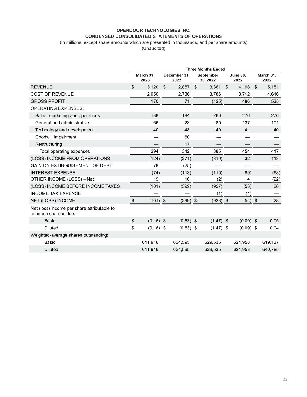 22 Three Months Ended March 31, 2023 December 31, 2022 September 30, 2022 June 30, 2022 March 31, 2022 REVENUE $ 3,120 $ 2,857 $ 3,361 $ 4,198 $ 5,151 COST OF REVENUE 2,950 2,786 3,786 3,712 4,616 GROSS PROFIT 170 71 (425) 486 535 OPERATING EXPENSES: Sales, marketing and operations 188 194 260 276 276 General and administrative 66 23 85 137 101 Technology and development 40 48 40 41 40 Goodwill Impairment — 60 — — — Restructuring — 17 — — — Total operating expenses 294 342 385 454 417 (LOSS) INCOME FROM OPERATIONS (124) (271) (810) 32 118 GAIN ON EXTINGUISHMENT OF DEBT 78 (25) — — — INTEREST EXPENSE (74) (113) (115) (89) (68) OTHER INCOME (LOSS) – Net 19 10 (2) 4 (22) (LOSS) INCOME BEFORE INCOME TAXES (101) (399) (927) (53) 28 INCOME TAX EXPENSE — — (1) (1) — NET (LOSS) INCOME $ (101) $ (399) $ (928) $ (54) $ 28 Net (loss) income per share attributable to common shareholders: Basic $ (0.16) $ (0.63) $ (1.47) $ (0.09) $ 0.05 Diluted $ (0.16) $ (0.63) $ (1.47) $ (0.09) $ 0.04 Weighted-average shares outstanding: Basic 641,916 634,595 629,535 624,958 619,137 Diluted 641,916 634,595 629,535 624,958 640,785 OPENDOOR TECHNOLOGIES INC. CONDENSED CONSOLIDATED STATEMENTS OF OPERATIONS (In millions, except share amounts which are presented in thousands, and per share amounts) (Unaudited)
