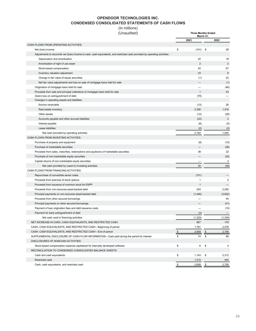 24 OPENDOOR TECHNOLOGIES INC. CONDENSED CONSOLIDATED STATEMENTS OF CASH FLOWS (In millions) (Unaudited) Three Months Ended March 31, 2023 2022 CASH FLOWS FROM OPERATING ACTIVITIES: Net (loss) income $ (101) $ 28 Adjustments to reconcile net (loss) income to cash, cash equivalents, and restricted cash provided by operating activities: Depreciation and amortization  22 18 Amortization of right of use asset 2 2 Stock-based compensation 42 67 Inventory valuation adjustment 23 8 Change in fair value of equity securities (1) 22 Net fair value adjustments and loss on sale of mortgage loans held for sale — (1) Origination of mortgage loans held for sale — (46) Proceeds from sale and principal collections of mortgage loans held for sale 1 43 (Gain) loss on extinguishment of debt (78) — Changes in operating assets and liabilities: Escrow receivable (12) 26 Real estate inventory 2,306 1,416 Other assets (10) (28) Accounts payable and other accrued liabilities (22) 2 Interest payable (8) (5) Lease liabilities (2) (2) Net cash provided by operating activities 2,162 1,550 CASH FLOWS FROM INVESTING ACTIVITIES: Purchase of property and equipment (8) (10) Purchase of marketable securities — (28) Proceeds from sales, maturities, redemptions and paydowns of marketable securities 38 22 Purchase of non-marketable equity securities — (25) Capital returns of non-marketable equity securities — 3 Net cash provided by (used in) investing activities 30 (38) CASH FLOWS FROM FINANCING ACTIVITIES: Repurchase of convertible senior notes (101) — Proceeds from exercise of stock options 1 2 Proceeds from issuance of common stock for ESPP 1 — Proceeds from non-recourse asset-backed debt 224 2,292 Principal payments on non-recourse asset-backed debt (1,446) (3,622) Proceeds from other secured borrowings — 45 Principal payments on other secured borrowings — (41) Payment of loan origination fees and debt issuance costs — (10) Payment for early extinguishment of debt (4) — Net cash used in financing activities (1,325) (1,334) NET INCREASE IN CASH, CASH EQUIVALENTS, AND RESTRICTED CASH 867 178 CASH, CASH EQUIVALENTS, AND RESTRICTED CASH – Beginning of period 1,791 2,578 CASH, CASH EQUIVALENTS, AND RESTRICTED CASH – End of period $ 2,658 $ 2,756 SUPPLEMENTAL DISCLOSURE OF CASH FLOW INFORMATION – Cash paid during the period for interest $ 74 $ 68 DISCLOSURES OF NONCASH ACTIVITIES: Stock-based compensation expense capitalized for internally developed software $ 6 $ 4 RECONCILIATION TO CONDENSED CONSOLIDATED BALANCE SHEETS: Cash and cash equivalents $ 1,143 $ 2,312 Restricted cash 1,515 444 Cash, cash equivalents, and restricted cash $ 2,658 $ 2,756