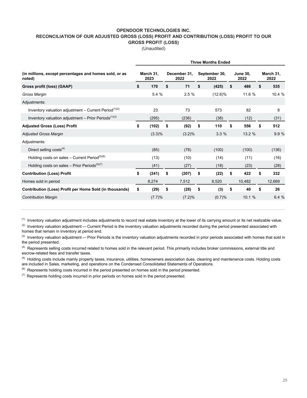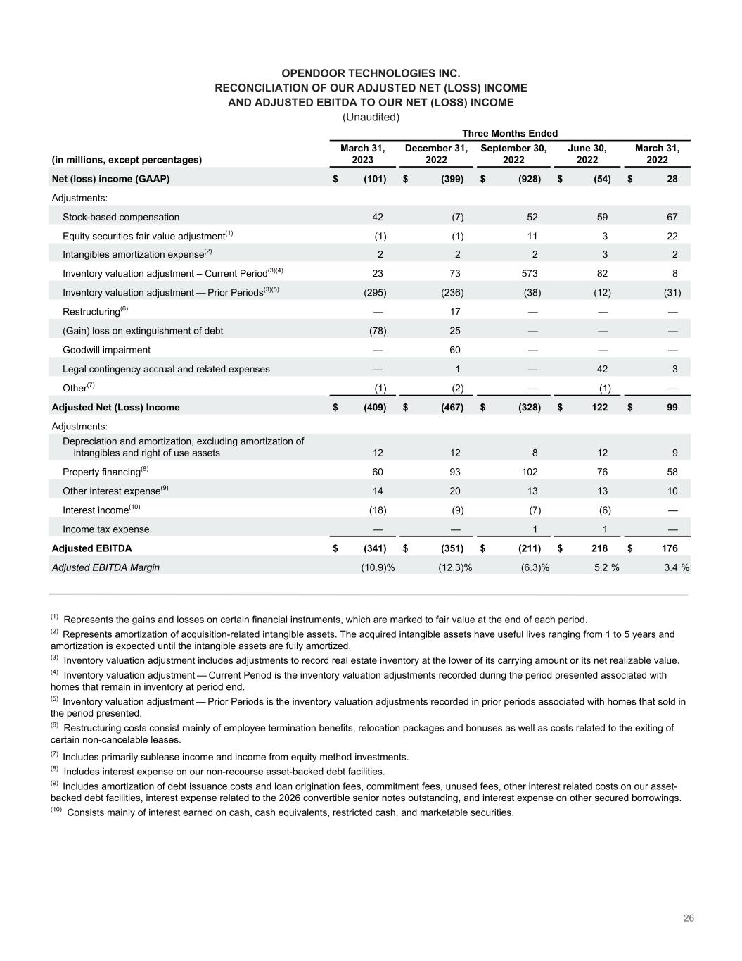 25 OPENDOOR TECHNOLOGIES INC. RECONCILIATION OF OUR ADJUSTED GROSS (LOSS) PROFIT AND CONTRIBUTION (LOSS) PROFIT TO OUR GROSS PROFIT (LOSS) (Unaudited) Three Months Ended (in millions, except percentages and homes sold, or as noted) March 31, 2023 December 31, 2022 September 30, 2022 June 30, 2022 March 31, 2022 Gross profit (loss) (GAAP) $ 170 $ 71 $ (425) $ 486 $ 535 Gross Margin 5.4 % 2.5 % (12.6) % 11.6 % 10.4 % Adjustments: Inventory valuation adjustment – Current Period͏(1)(2) 23 73 573 82 8 Inventory valuation adjustment – Prior Periods͏(1)(3) (295) (236) (38) (12) (31) Adjusted Gross (Loss) Profit $ (102) $ (92) $ 110 $ 556 $ 512 Adjusted Gross Margin (3.3) % (3.2) % 3.3 % 13.2 % 9.9 % Adjustments: Direct selling costs(4) (85) (78) (100) (100) (136) Holding costs on sales – Current Period͏(5)(6) (13) (10) (14) (11) (16) Holding costs on sales – Prior Periods͏(5)(7) (41) (27) (18) (23) (28) Contribution (Loss) Profit $ (241) $ (207) $ (22) $ 422 $ 332 Homes sold in period 8,274 7,512 8,520 10,482 12,669 Contribution (Loss) Profit per Home Sold (in thousands) $ (29) $ (28) $ (3) $ 40 $ 26 Contribution Margin (7.7) % (7.2) % (0.7) % 10.1 % 6.4 % (1) Inventory valuation adjustment includes adjustments to record real estate inventory at the lower of its carrying amount or its net realizable value. (2) Inventory valuation adjustment — Current Period is the inventory valuation adjustments recorded during the period presented associated with homes that remain in inventory at period end. (3) Inventory valuation adjustment — Prior Periods is the inventory valuation adjustments recorded in prior periods associated with homes that sold in the period presented. (4) Represents selling costs incurred related to homes sold in the relevant period. This primarily includes broker commissions, external title and escrow-related fees and transfer taxes. (5) Holding costs include mainly property taxes, insurance, utilities, homeowners association dues, cleaning and maintenance costs. Holding costs are included in Sales, marketing, and operations on the Condensed Consolidated Statements of Operations. (6) Represents holding costs incurred in the period presented on homes sold in the period presented. (7) Represents holding costs incurred in prior periods on homes sold in the period presented.