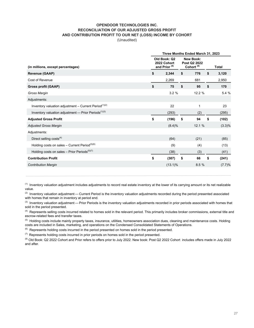 27 OPENDOOR TECHNOLOGIES INC. RECONCILIATION OF OUR ADJUSTED GROSS PROFIT AND CONTRIBUTION PROFIT TO OUR NET (LOSS) INCOME BY COHORT (Unaudited) Three Months Ended March 31, 2023 (in millions, except percentages) Old Book: Q2 2022 Cohort and Prior (8) New Book: Post Q2 2022 Cohort (8) Total Revenue (GAAP) $ 2,344 $ 776 $ 3,120 Cost of Revenue 2,269 681 2,950 Gross profit (GAAP) $ 75 $ 95 $ 170 Gross Margin 3.2 % 12.2 % 5.4 % Adjustments: Inventory valuation adjustment – Current Period͏(1)(2) 22 1 23 Inventory valuation adjustment — Prior Periods͏(1)(3) (293) (2) (295) Adjusted Gross Profit $ (196) $ 94 $ (102) Adjusted Gross Margin (8.4) % 12.1 % (3.3) % Adjustments: Direct selling costs(4) (64) (21) (85) Holding costs on sales – Current Period͏(5)(6) (9) (4) (13) Holding costs on sales – Prior Periods͏(5)(7) (38) (3) (41) Contribution Profit $ (307) $ 66 $ (241) Contribution Margin (13.1) % 8.5 % (7.7) % (1) Inventory valuation adjustment includes adjustments to record real estate inventory at the lower of its carrying amount or its net realizable value. (2) Inventory valuation adjustment — Current Period is the inventory valuation adjustments recorded during the period presented associated with homes that remain in inventory at period end. (3) Inventory valuation adjustment — Prior Periods is the inventory valuation adjustments recorded in prior periods associated with homes that sold in the period presented. (4) Represents selling costs incurred related to homes sold in the relevant period. This primarily includes broker commissions, external title and escrow-related fees and transfer taxes. (5) Holding costs include mainly property taxes, insurance, utilities, homeowners association dues, cleaning and maintenance costs. Holding costs are included in Sales, marketing, and operations on the Condensed Consolidated Statements of Operations. (6) Represents holding costs incurred in the period presented on homes sold in the period presented. (7) Represents holding costs incurred in prior periods on homes sold in the period presented. (8) Old Book: Q2 2022 Cohort and Prior refers to offers prior to July 2022. New book: Post Q2 2022 Cohort includes offers made in July 2022 and after.