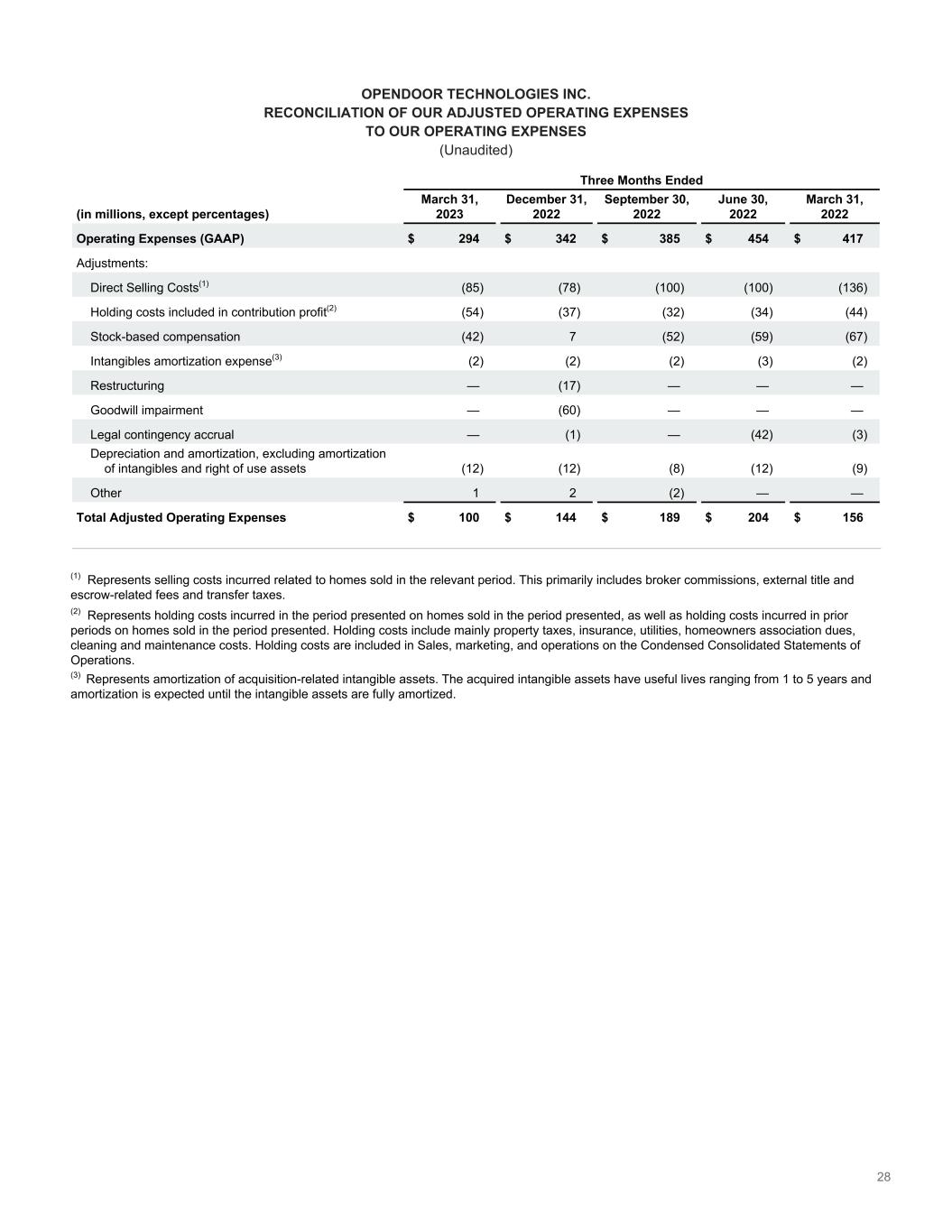 28 OPENDOOR TECHNOLOGIES INC. RECONCILIATION OF OUR ADJUSTED OPERATING EXPENSES TO OUR OPERATING EXPENSES (Unaudited) Three Months Ended (in millions, except percentages) March 31, 2023 December 31, 2022 September 30, 2022 June 30, 2022 March 31, 2022 Operating Expenses (GAAP) $ 294 $ 342 $ 385 $ 454 $ 417 Adjustments: Direct Selling Costs(1) (85) (78) (100) (100) (136) Holding costs included in contribution profit(2) (54) (37) (32) (34) (44) Stock-based compensation (42) 7 (52) (59) (67) Intangibles amortization expense(3) (2) (2) (2) (3) (2) Restructuring — (17) — — — Goodwill impairment — (60) — — — Legal contingency accrual — (1) — (42) (3) Depreciation and amortization, excluding amortization of intangibles and right of use assets (12) (12) (8) (12) (9) Other 1 2 (2) — — Total Adjusted Operating Expenses $ 100 $ 144 $ 189 $ 204 $ 156 (1) Represents selling costs incurred related to homes sold in the relevant period. This primarily includes broker commissions, external title and escrow-related fees and transfer taxes. (2) Represents holding costs incurred in the period presented on homes sold in the period presented, as well as holding costs incurred in prior periods on homes sold in the period presented. Holding costs include mainly property taxes, insurance, utilities, homeowners association dues, cleaning and maintenance costs. Holding costs are included in Sales, marketing, and operations on the Condensed Consolidated Statements of Operations. (3) Represents amortization of acquisition-related intangible assets. The acquired intangible assets have useful lives ranging from 1 to 5 years and amortization is expected until the intangible assets are fully amortized.