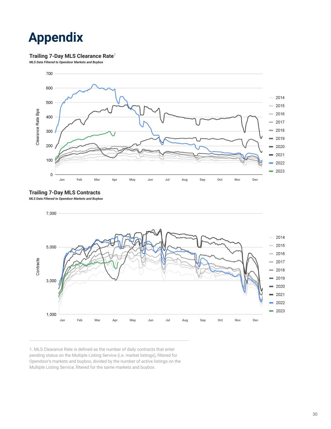 Appendix 1. MLS Clearance Rate is defined as the number of daily contracts that enter pending status on the Multiple Listing Service (i.e. market listings), filtered for Opendoor’s markets and buybox, divided by the number of active listings on the Multiple Listing Service, filtered for the same markets and buybox. Trailing 7-Day MLS Clearance Rate1 MLS Data Filtered to Opendoor Markets and Buybox Trailing 7-Day MLS Contracts MLS Data Filtered to Opendoor Markets and Buybox 1830 Jan Feb Mar Apr May Jun Jul Aug Sep Oct Nov Dec Jan Feb Mar Apr May Jun Jul Aug Sep Oct Nov Dec