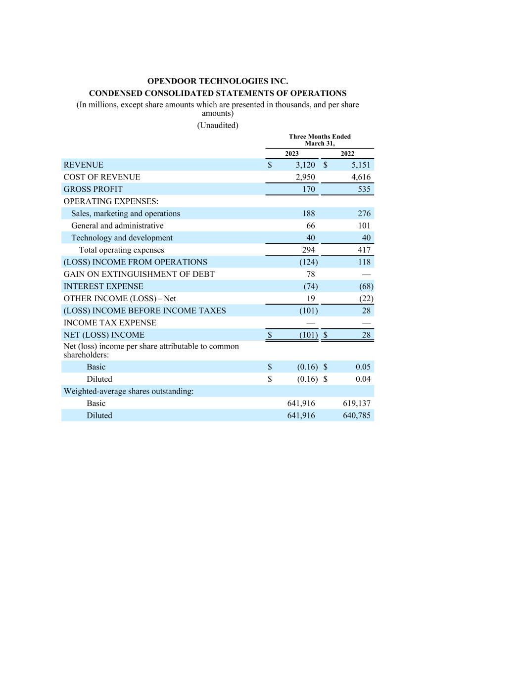 OPENDOOR TECHNOLOGIES INC. CONDENSED CONSOLIDATED STATEMENTS OF OPERATIONS (In millions, except share amounts which are presented in thousands, and per share amounts) (Unaudited) Three Months Ended March 31, 2023 2022 REVENUE $ 3,120 $ 5,151 COST OF REVENUE 2,950 4,616 GROSS PROFIT 170 535 OPERATING EXPENSES: Sales, marketing and operations 188 276 General and administrative 66 101 Technology and development 40 40 Total operating expenses 294 417 (LOSS) INCOME FROM OPERATIONS (124) 118 GAIN ON EXTINGUISHMENT OF DEBT 78 — INTEREST EXPENSE (74) (68) OTHER INCOME (LOSS) – Net 19 (22) (LOSS) INCOME BEFORE INCOME TAXES (101) 28 INCOME TAX EXPENSE — — NET (LOSS) INCOME $ (101) $ 28 Net (loss) income per share attributable to common shareholders: Basic $ (0.16) $ 0.05 Diluted $ (0.16) $ 0.04 Weighted-average shares outstanding: Basic 641,916 619,137 Diluted 641,916 640,785