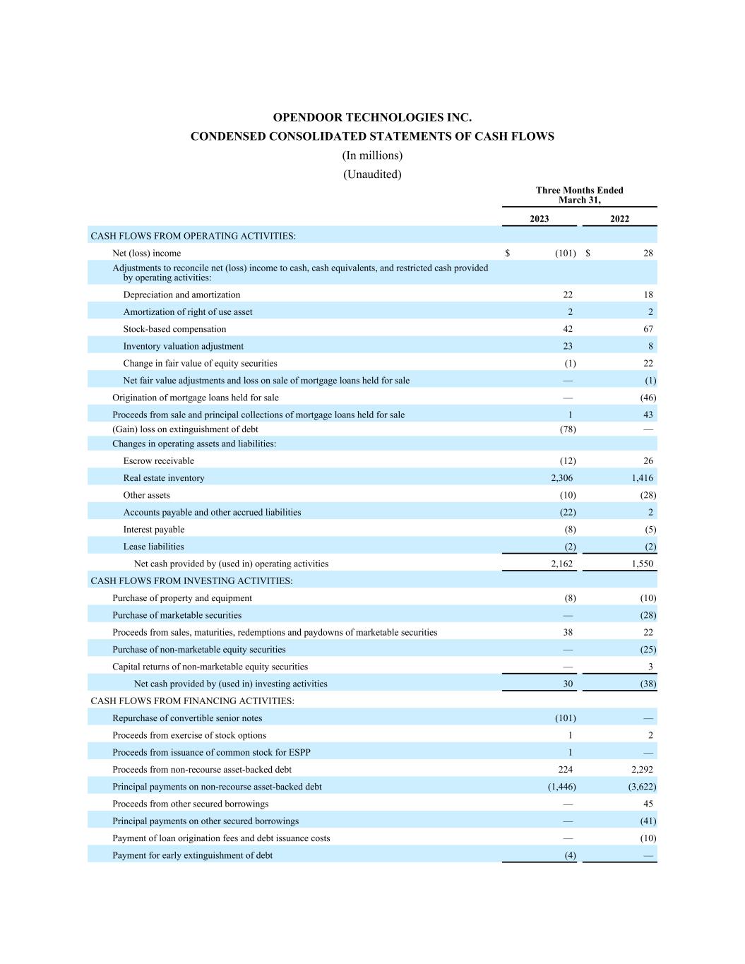 OPENDOOR TECHNOLOGIES INC. CONDENSED CONSOLIDATED STATEMENTS OF CASH FLOWS (In millions) (Unaudited) Three Months Ended March 31, 2023 2022 CASH FLOWS FROM OPERATING ACTIVITIES: Net (loss) income $ (101) $ 28 Adjustments to reconcile net (loss) income to cash, cash equivalents, and restricted cash provided by operating activities: Depreciation and amortization  22 18 Amortization of right of use asset 2 2 Stock-based compensation 42 67 Inventory valuation adjustment 23 8 Change in fair value of equity securities (1) 22 Net fair value adjustments and loss on sale of mortgage loans held for sale — (1) Origination of mortgage loans held for sale — (46) Proceeds from sale and principal collections of mortgage loans held for sale 1 43 (Gain) loss on extinguishment of debt (78) — Changes in operating assets and liabilities: Escrow receivable (12) 26 Real estate inventory 2,306 1,416 Other assets (10) (28) Accounts payable and other accrued liabilities (22) 2 Interest payable (8) (5) Lease liabilities (2) (2) Net cash provided by (used in) operating activities 2,162 1,550 CASH FLOWS FROM INVESTING ACTIVITIES: Purchase of property and equipment (8) (10) Purchase of marketable securities — (28) Proceeds from sales, maturities, redemptions and paydowns of marketable securities 38 22 Purchase of non-marketable equity securities — (25) Capital returns of non-marketable equity securities — 3 Net cash provided by (used in) investing activities 30 (38) CASH FLOWS FROM FINANCING ACTIVITIES: Repurchase of convertible senior notes (101) — Proceeds from exercise of stock options 1 2 Proceeds from issuance of common stock for ESPP 1 — Proceeds from non-recourse asset-backed debt 224 2,292 Principal payments on non-recourse asset-backed debt (1,446) (3,622) Proceeds from other secured borrowings — 45 Principal payments on other secured borrowings — (41) Payment of loan origination fees and debt issuance costs — (10) Payment for early extinguishment of debt (4) —