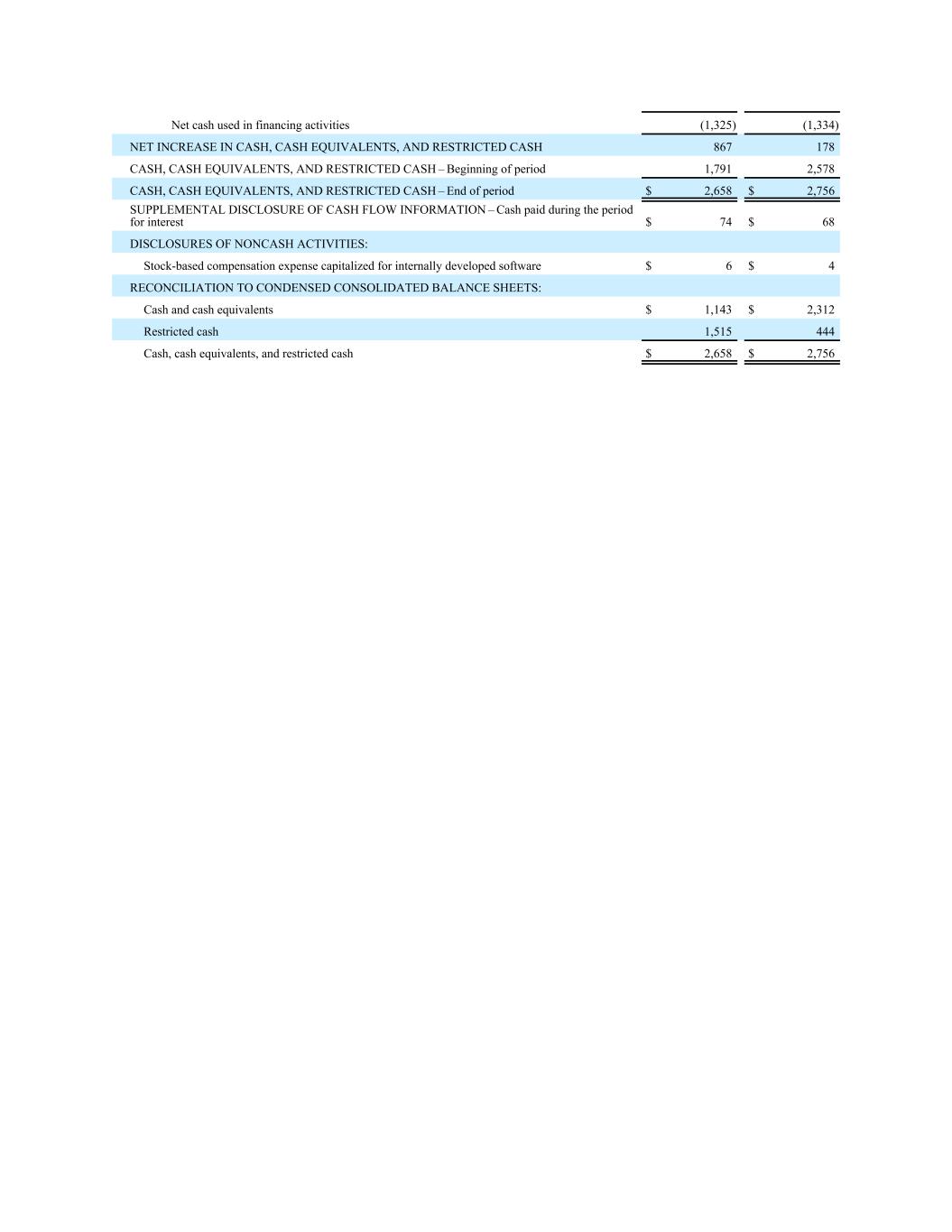 Net cash used in financing activities (1,325) (1,334) NET INCREASE IN CASH, CASH EQUIVALENTS, AND RESTRICTED CASH 867 178 CASH, CASH EQUIVALENTS, AND RESTRICTED CASH – Beginning of period 1,791 2,578 CASH, CASH EQUIVALENTS, AND RESTRICTED CASH – End of period $ 2,658 $ 2,756 SUPPLEMENTAL DISCLOSURE OF CASH FLOW INFORMATION – Cash paid during the period for interest $ 74 $ 68 DISCLOSURES OF NONCASH ACTIVITIES: Stock-based compensation expense capitalized for internally developed software $ 6 $ 4 RECONCILIATION TO CONDENSED CONSOLIDATED BALANCE SHEETS: Cash and cash equivalents $ 1,143 $ 2,312 Restricted cash 1,515 444 Cash, cash equivalents, and restricted cash $ 2,658 $ 2,756