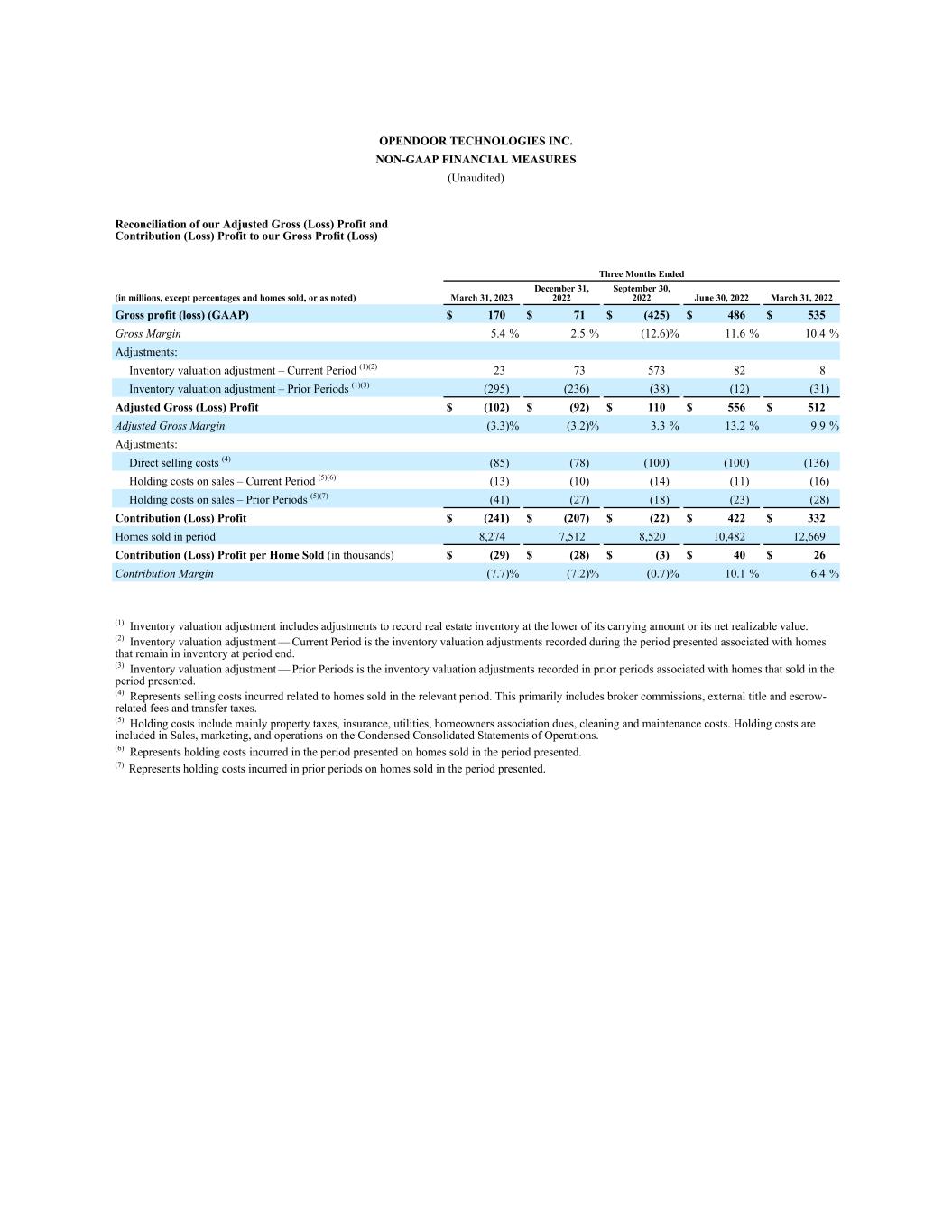 OPENDOOR TECHNOLOGIES INC. NON-GAAP FINANCIAL MEASURES (Unaudited) Reconciliation of our Adjusted Gross (Loss) Profit and Contribution (Loss) Profit to our Gross Profit (Loss) Three Months Ended (in millions, except percentages and homes sold, or as noted) March 31, 2023 December 31, 2022 September 30, 2022 June 30, 2022 March 31, 2022 Gross profit (loss) (GAAP) $ 170 $ 71 $ (425) $ 486 $ 535 Gross Margin 5.4 % 2.5 % (12.6) % 11.6 % 10.4 % Adjustments: Inventory valuation adjustment – Current Period͏ (1)(2) 23 73 573 82 8 Inventory valuation adjustment – Prior Periods͏ (1)(3) (295) (236) (38) (12) (31) Adjusted Gross (Loss) Profit $ (102) $ (92) $ 110 $ 556 $ 512 Adjusted Gross Margin (3.3) % (3.2) % 3.3 % 13.2 % 9.9 % Adjustments: Direct selling costs (4) (85) (78) (100) (100) (136) Holding costs on sales – Current Period͏ (5)(6) (13) (10) (14) (11) (16) Holding costs on sales – Prior Periods͏ (5)(7) (41) (27) (18) (23) (28) Contribution (Loss) Profit $ (241) $ (207) $ (22) $ 422 $ 332 Homes sold in period 8,274 7,512 8,520 10,482 12,669 Contribution (Loss) Profit per Home Sold (in thousands) $ (29) $ (28) $ (3) $ 40 $ 26 Contribution Margin (7.7) % (7.2) % (0.7) % 10.1 % 6.4 % (1) Inventory valuation adjustment includes adjustments to record real estate inventory at the lower of its carrying amount or its net realizable value. (2) Inventory valuation adjustment — Current Period is the inventory valuation adjustments recorded during the period presented associated with homes that remain in inventory at period end. (3) Inventory valuation adjustment — Prior Periods is the inventory valuation adjustments recorded in prior periods associated with homes that sold in the period presented. (4) Represents selling costs incurred related to homes sold in the relevant period. This primarily includes broker commissions, external title and escrow- related fees and transfer taxes. (5) Holding costs include mainly property taxes, insurance, utilities, homeowners association dues, cleaning and maintenance costs. Holding costs are included in Sales, marketing, and operations on the Condensed Consolidated Statements of Operations. (6) Represents holding costs incurred in the period presented on homes sold in the period presented. (7) Represents holding costs incurred in prior periods on homes sold in the period presented.