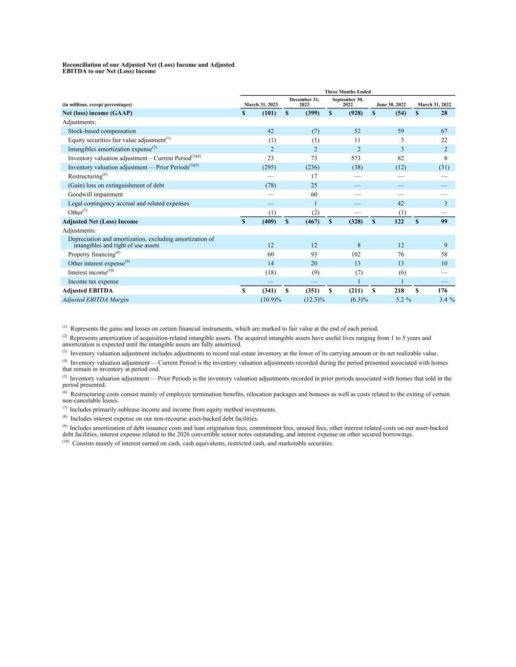 Reconciliation of our Adjusted Net (Loss) Income and Adjusted EBITDA to our Net (Loss) Income Three Months Ended (in millions, except percentages) March 31, 2023 December 31, 2022 September 30, 2022 June 30, 2022 March 31, 2022 Net (loss) income (GAAP) $ (101) $ (399) $ (928) $ (54) $ 28 Adjustments: Stock-based compensation 42 (7) 52 59 67 Equity securities fair value adjustment(1) (1) (1) 11 3 22 Intangibles amortization expense(2) 2 2 2 3 2 Inventory valuation adjustment – Current Period͏(3)(4) 23 73 573 82 8 Inventory valuation adjustment — Prior Periods͏(3)(5) (295) (236) (38) (12) (31) Restructuring(6) — 17 — — — (Gain) loss on extinguishment of debt (78) 25 — — — Goodwill impairment — 60 — — — Legal contingency accrual and related expenses — 1 — 42 3 Other(7) (1) (2) — (1) — Adjusted Net (Loss) Income $ (409) $ (467) $ (328) $ 122 $ 99 Adjustments: Depreciation and amortization, excluding amortization of intangibles and right of use assets 12 12 8 12 9 Property financing(8) 60 93 102 76 58 Other interest expense(9) 14 20 13 13 10 Interest income(10) (18) (9) (7) (6) — Income tax expense — — 1 1 — Adjusted EBITDA $ (341) $ (351) $ (211) $ 218 $ 176 Adjusted EBITDA Margin (10.9) % (12.3) % (6.3) % 5.2 % 3.4 % (1) Represents the gains and losses on certain financial instruments, which are marked to fair value at the end of each period. (2) Represents amortization of acquisition-related intangible assets. The acquired intangible assets have useful lives ranging from 1 to 5 years and amortization is expected until the intangible assets are fully amortized. (3) Inventory valuation adjustment includes adjustments to record real estate inventory at the lower of its carrying amount or its net realizable value. (4) Inventory valuation adjustment — Current Period is the inventory valuation adjustments recorded during the period presented associated with homes that remain in inventory at period end. (5) Inventory valuation adjustment — Prior Periods is the inventory valuation adjustments recorded in prior periods associated with homes that sold in the period presented. (6) Restructuring costs consist mainly of employee termination benefits, relocation packages and bonuses as well as costs related to the exiting of certain non-cancelable leases. (7) Includes primarily sublease income and income from equity method investments. (8) Includes interest expense on our non-recourse asset-backed debt facilities. (9) Includes amortization of debt issuance costs and loan origination fees, commitment fees, unused fees, other interest related costs on our asset-backed debt facilities, interest expense related to the 2026 convertible senior notes outstanding, and interest expense on other secured borrowings. (10) Consists mainly of interest earned on cash, cash equivalents, restricted cash, and marketable securities.