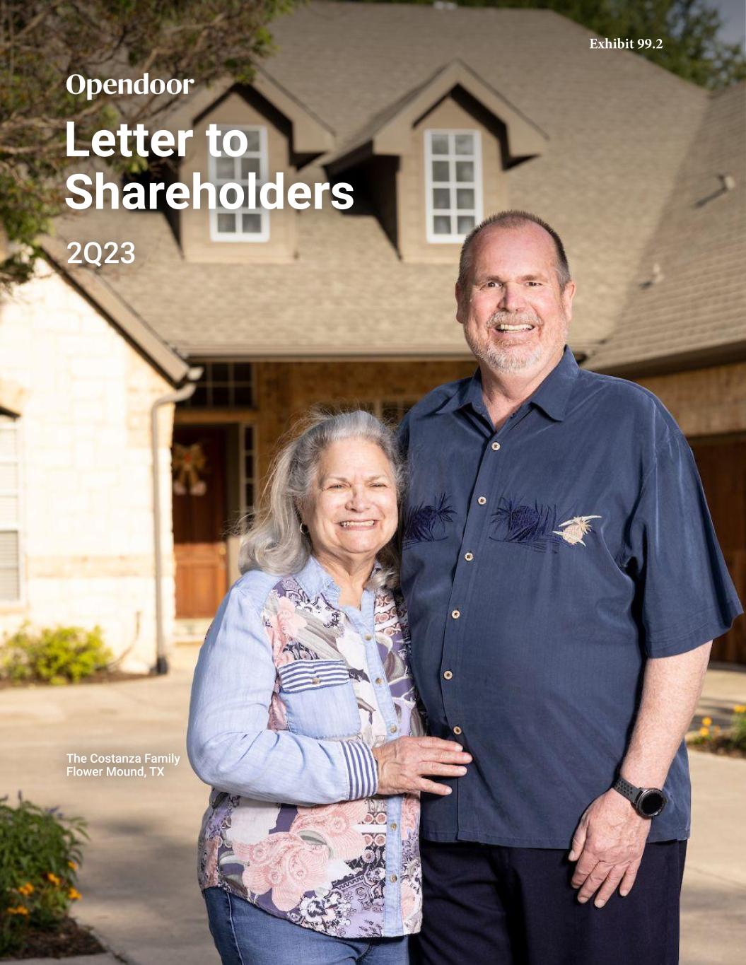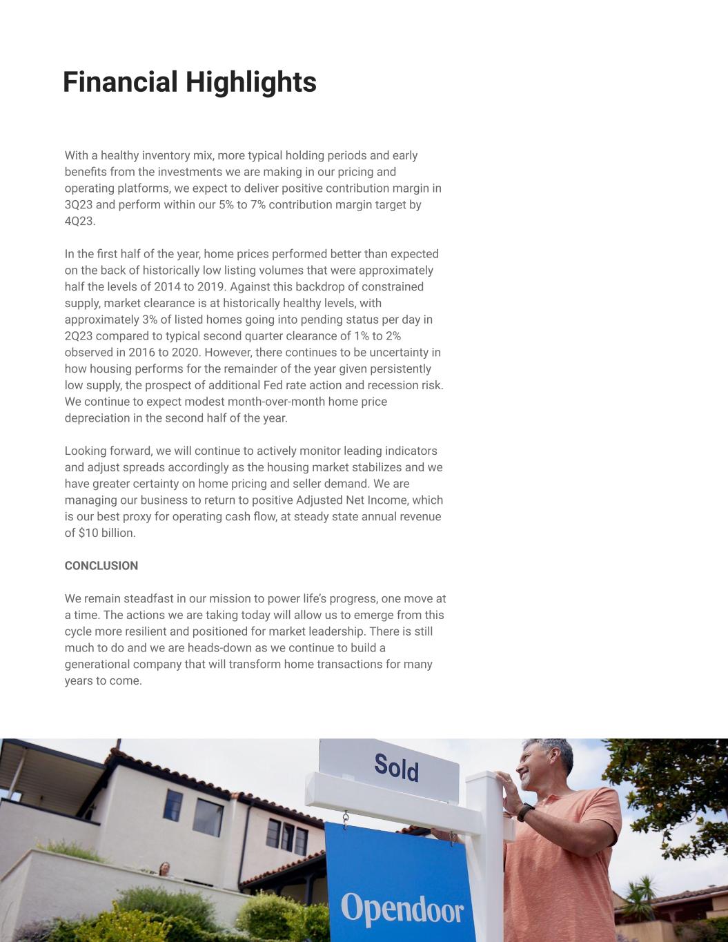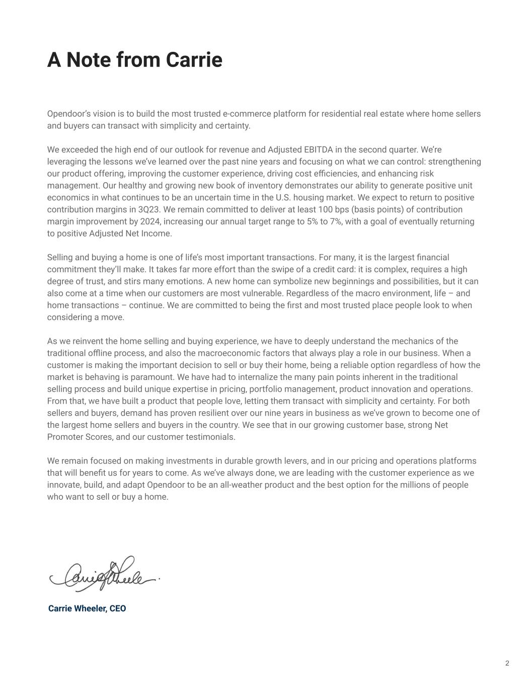 Opendoor’s vision is to build the most trusted e-commerce platform for residential real estate where home sellers and buyers can transact with simplicity and certainty. We exceeded the high end of our outlook for revenue and Adjusted EBITDA in the second quarter. We’re leveraging the lessons we’ve learned over the past nine years and focusing on what we can control: strengthening our product offering, improving the customer experience, driving cost efficiencies, and enhancing risk management. Our healthy and growing new book of inventory demonstrates our ability to generate positive unit economics in what continues to be an uncertain time in the U.S. housing market. We expect to return to positive contribution margins in 3Q23. We remain committed to deliver at least 100 bps (basis points) of contribution margin improvement by 2024, increasing our annual target range to 5% to 7%, with a goal of eventually returning to positive Adjusted Net Income. Selling and buying a home is one of life’s most important transactions. For many, it is the largest financial commitment they’ll make. It takes far more effort than the swipe of a credit card: it is complex, requires a high degree of trust, and stirs many emotions. A new home can symbolize new beginnings and possibilities, but it can also come at a time when our customers are most vulnerable. Regardless of the macro environment, life – and home transactions – continue. We are committed to being the first and most trusted place people look to when considering a move. As we reinvent the home selling and buying experience, we have to deeply understand the mechanics of the traditional offline process, and also the macroeconomic factors that always play a role in our business. When a customer is making the important decision to sell or buy their home, being a reliable option regardless of how the market is behaving is paramount. We have had to internalize the many pain points inherent in the traditional selling process and build unique expertise in pricing, portfolio management, product innovation and operations. From that, we have built a product that people love, letting them transact with simplicity and certainty. For both sellers and buyers, demand has proven resilient over our nine years in business as we’ve grown to become one of the largest home sellers and buyers in the country. We see that in our growing customer base, strong Net Promoter Scores, and our customer testimonials. We remain focused on making investments in durable growth levers, and in our pricing and operations platforms that will benefit us for years to come. As we’ve always done, we are leading with the customer experience as we innovate, build, and adapt Opendoor to be an all-weather product and the best option for the millions of people who want to sell or buy a home. Carrie Wheeler, CEO 2 A Note from Carrie