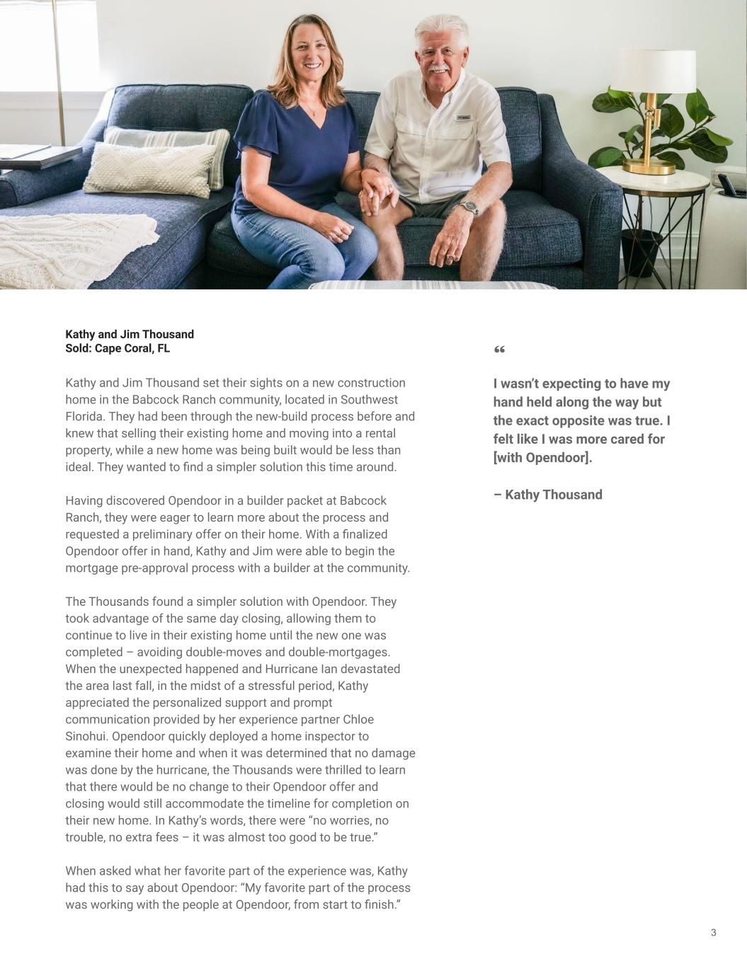 Kathy and Jim Thousand Sold: Cape Coral, FL 3 I wasn’t expecting to have my hand held along the way but the exact opposite was true. I felt like I was more cared for [with Opendoor]. – Kathy Thousand Kathy and Jim Thousand set their sights on a new construction home in the Babcock Ranch community, located in Southwest Florida. They had been through the new-build process before and knew that selling their existing home and moving into a rental property, while a new home was being built would be less than ideal. They wanted to find a simpler solution this time around. Having discovered Opendoor in a builder packet at Babcock Ranch, they were eager to learn more about the process and requested a preliminary offer on their home. With a finalized Opendoor offer in hand, Kathy and Jim were able to begin the mortgage pre-approval process with a builder at the community. The Thousands found a simpler solution with Opendoor. They took advantage of the same day closing, allowing them to continue to live in their existing home until the new one was completed – avoiding double-moves and double-mortgages. When the unexpected happened and Hurricane Ian devastated the area last fall, in the midst of a stressful period, Kathy appreciated the personalized support and prompt communication provided by her experience partner Chloe Sinohui. Opendoor quickly deployed a home inspector to examine their home and when it was determined that no damage was done by the hurricane, the Thousands were thrilled to learn that there would be no change to their Opendoor offer and closing would still accommodate the timeline for completion on their new home. In Kathy’s words, there were “no worries, no trouble, no extra fees – it was almost too good to be true.” When asked what her favorite part of the experience was, Kathy had this to say about Opendoor: “My favorite part of the process was working with the people at Opendoor, from start to finish.”