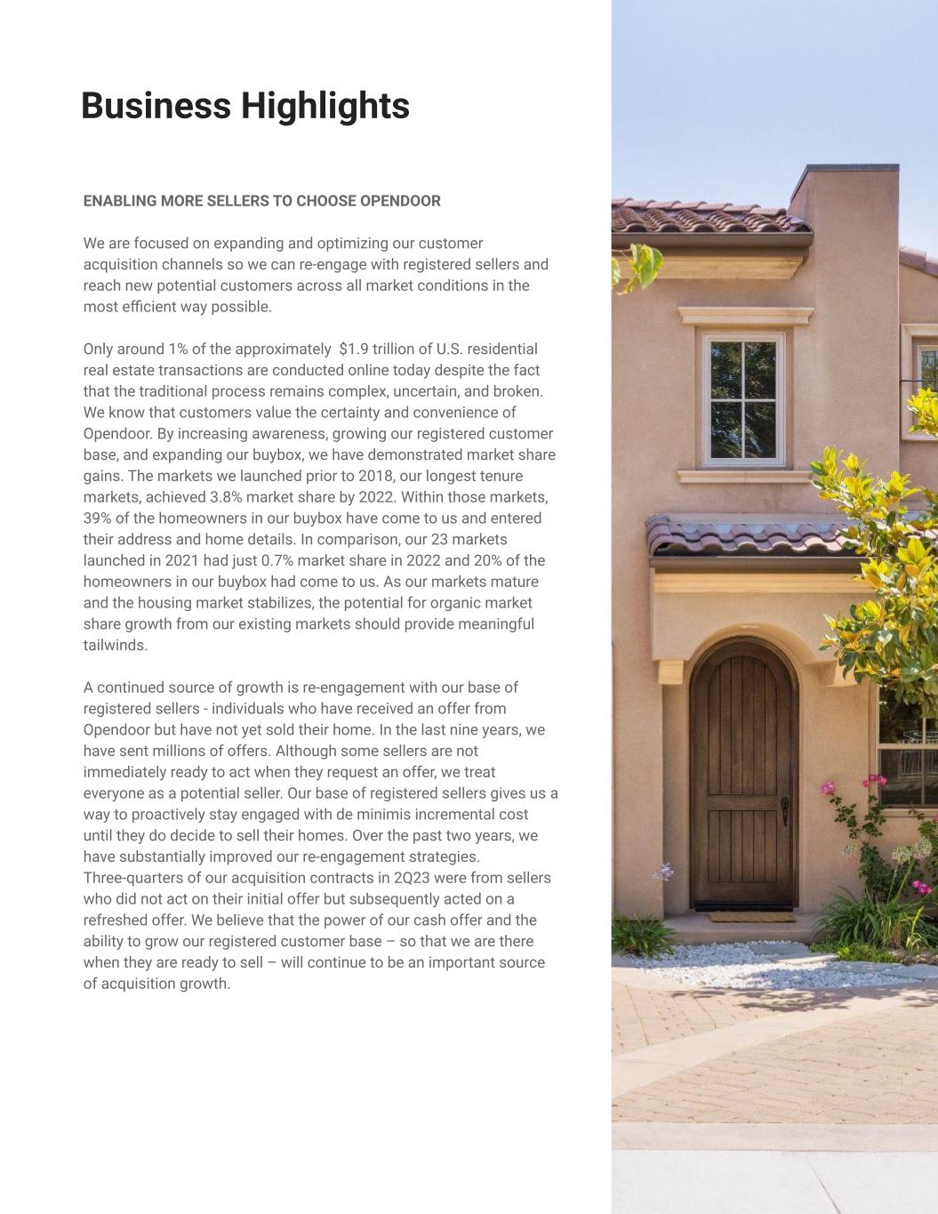 ENABLING MORE SELLERS TO CHOOSE OPENDOOR We are focused on expanding and optimizing our customer acquisition channels so we can re-engage with registered sellers and reach new potential customers across all market conditions in the most efficient way possible. Only around 1% of the approximately $1.9 trillion of U.S. residential real estate transactions are conducted online today despite the fact that the traditional process remains complex, uncertain, and broken. We know that customers value the certainty and convenience of Opendoor. By increasing awareness, growing our registered customer base, and expanding our buybox, we have demonstrated market share gains. The markets we launched prior to 2018, our longest tenure markets, achieved 3.8% market share by 2022. Within those markets, 39% of the homeowners in our buybox have come to us and entered their address and home details. In comparison, our 23 markets launched in 2021 had just 0.7% market share in 2022 and 20% of the homeowners in our buybox had come to us. As our markets mature and the housing market stabilizes, the potential for organic market share growth from our existing markets should provide meaningful tailwinds. A continued source of growth is re-engagement with our base of registered sellers - individuals who have received an offer from Opendoor but have not yet sold their home. In the last nine years, we have sent millions of offers. Although some sellers are not immediately ready to act when they request an offer, we treat everyone as a potential seller. Our base of registered sellers gives us a way to proactively stay engaged with de minimis incremental cost until they do decide to sell their homes. Over the past two years, we have substantially improved our re-engagement strategies. Three-quarters of our acquisition contracts in 2Q23 were from sellers who did not act on their initial offer but subsequently acted on a refreshed offer. We believe that the power of our cash offer and the ability to grow our registered customer base – so that we are there when they are ready to sell – will continue to be an important source of acquisition growth. Lorem ipsum: Graph 4 Business Highlights