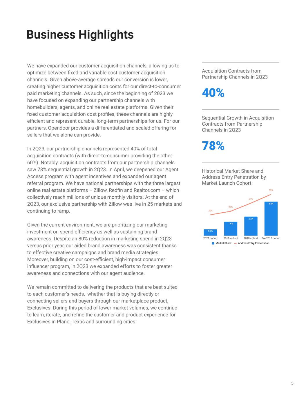 We have expanded our customer acquisition channels, allowing us to optimize between fixed and variable cost customer acquisition channels. Given above-average spreads our conversion is lower, creating higher customer acquisition costs for our direct-to-consumer paid marketing channels. As such, since the beginning of 2023 we have focused on expanding our partnership channels with homebuilders, agents, and online real estate platforms. Given their fixed customer acquisition cost profiles, these channels are highly efficient and represent durable, long-term partnerships for us. For our partners, Opendoor provides a differentiated and scaled offering for sellers that we alone can provide. In 2Q23, our partnership channels represented 40% of total acquisition contracts (with direct-to-consumer providing the other 60%). Notably, acquisition contracts from our partnership channels saw 78% sequential growth in 2Q23. In April, we deepened our Agent Access program with agent incentives and expanded our agent referral program. We have national partnerships with the three largest online real estate platforms – Zillow, Redfin and Realtor.com – which collectively reach millions of unique monthly visitors. At the end of 2Q23, our exclusive partnership with Zillow was live in 25 markets and continuing to ramp. Given the current environment, we are prioritizing our marketing investment on spend efficiency as well as sustaining brand awareness. Despite an 80% reduction in marketing spend in 2Q23 versus prior year, our aided brand awareness was consistent thanks to effective creative campaigns and brand media strategies. Moreover, building on our cost-efficient, high-impact consumer influencer program, in 2Q23 we expanded efforts to foster greater awareness and connections with our agent audience. We remain committed to delivering the products that are best suited to each customer’s needs, whether that is buying directly or connecting sellers and buyers through our marketplace product, Exclusives. During this period of lower market volumes, we continue to learn, iterate, and refine the customer and product experience for Exclusives in Plano, Texas and surrounding cities. 5 Business Highlights Sequential Growth in Acquisition Contracts from Partnership Channels in 2Q23 78% Acquisition Contracts from Partnership Channels in 2Q23 40% Historical Market Share and Address Entry Penetration by Market Launch Cohort