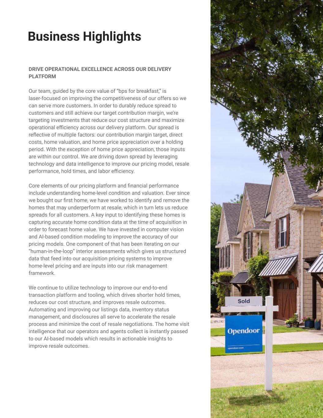 DRIVE OPERATIONAL EXCELLENCE ACROSS OUR DELIVERY PLATFORM Our team, guided by the core value of “bps for breakfast,” is laser-focused on improving the competitiveness of our offers so we can serve more customers. In order to durably reduce spread to customers and still achieve our target contribution margin, we’re targeting investments that reduce our cost structure and maximize operational efficiency across our delivery platform. Our spread is reflective of multiple factors: our contribution margin target, direct costs, home valuation, and home price appreciation over a holding period. With the exception of home price appreciation, those inputs are within our control. We are driving down spread by leveraging technology and data intelligence to improve our pricing model, resale performance, hold times, and labor efficiency. Core elements of our pricing platform and financial performance include understanding home-level condition and valuation. Ever since we bought our first home, we have worked to identify and remove the homes that may underperform at resale, which in turn lets us reduce spreads for all customers. A key input to identifying these homes is capturing accurate home condition data at the time of acquisition in order to forecast home value. We have invested in computer vision and AI-based condition modeling to improve the accuracy of our pricing models. One component of that has been iterating on our “human-in-the-loop” interior assessments which gives us structured data that feed into our acquisition pricing systems to improve home-level pricing and are inputs into our risk management framework. We continue to utilize technology to improve our end-to-end transaction platform and tooling, which drives shorter hold times, reduces our cost structure, and improves resale outcomes. Automating and improving our listings data, inventory status management, and disclosures all serve to accelerate the resale process and minimize the cost of resale negotiations. The home visit intelligence that our operators and agents collect is instantly passed to our AI-based models which results in actionable insights to improve resale outcomes. 6 Expected Margin Improvement in 2024 via Increased Efficiencies Business Highlights >100 bps