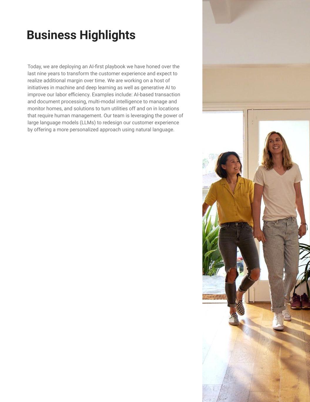 Today, we are deploying an AI-first playbook we have honed over the last nine years to transform the customer experience and expect to realize additional margin over time. We are working on a host of initiatives in machine and deep learning as well as generative AI to improve our labor efficiency. Examples include: AI-based transaction and document processing, multi-modal intelligence to manage and monitor homes, and solutions to turn utilities off and on in locations that require human management. Our team is leveraging the power of large language models (LLMs) to redesign our customer experience by offering a more personalized approach using natural language. 7 Business Highlights List with Certainty